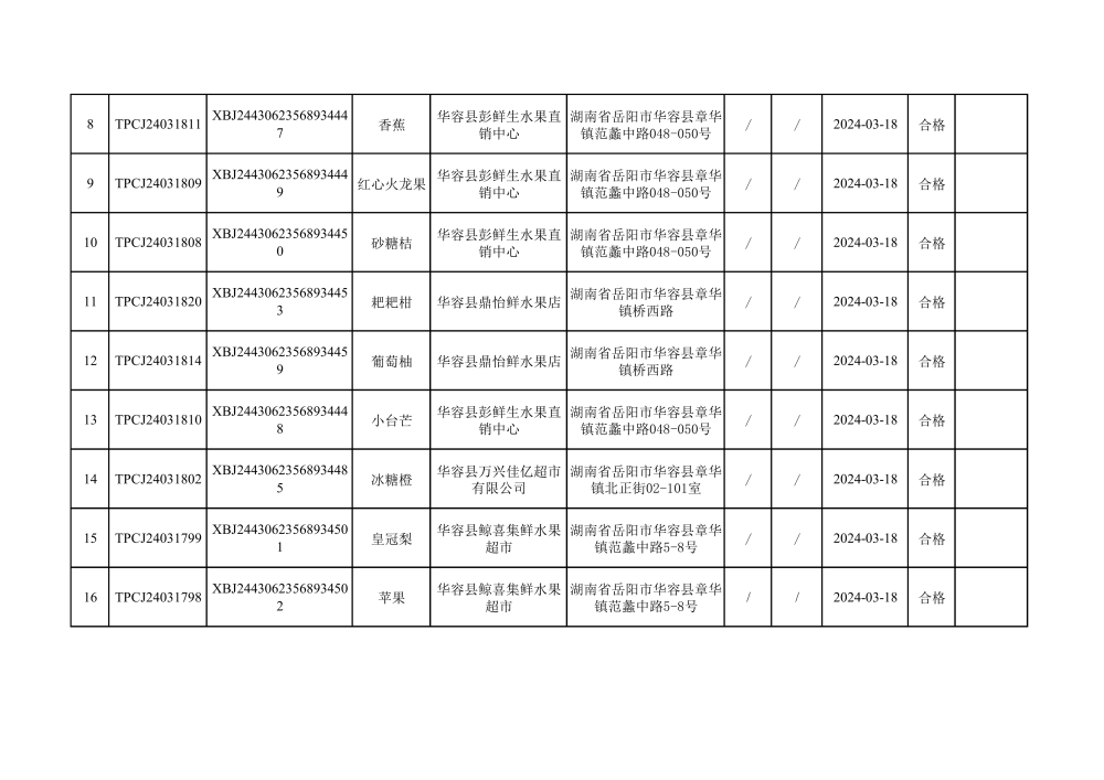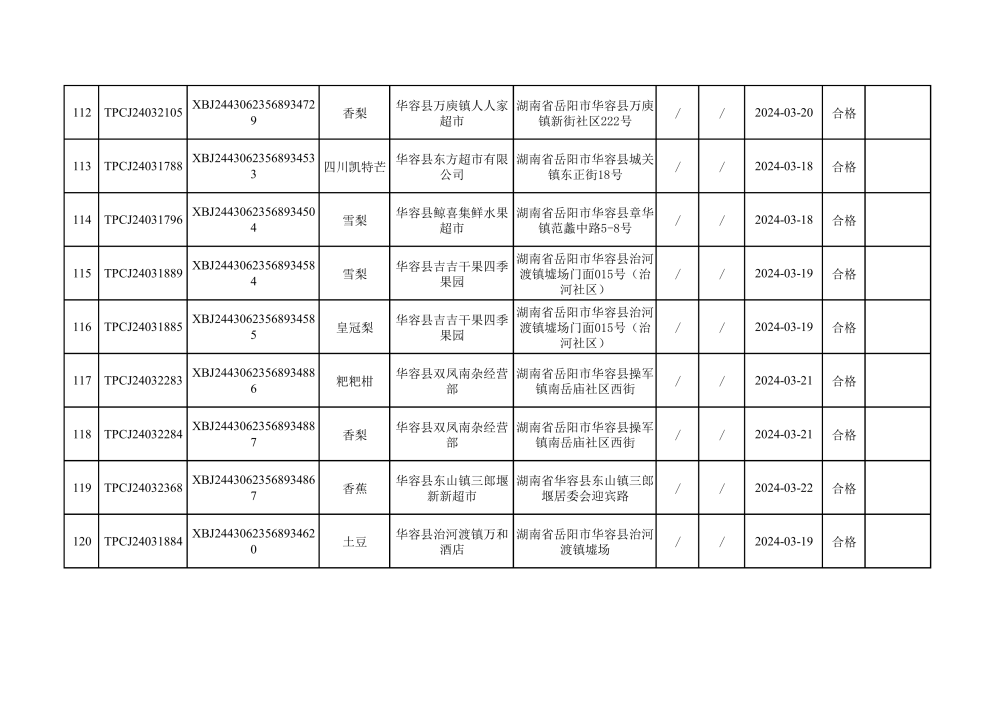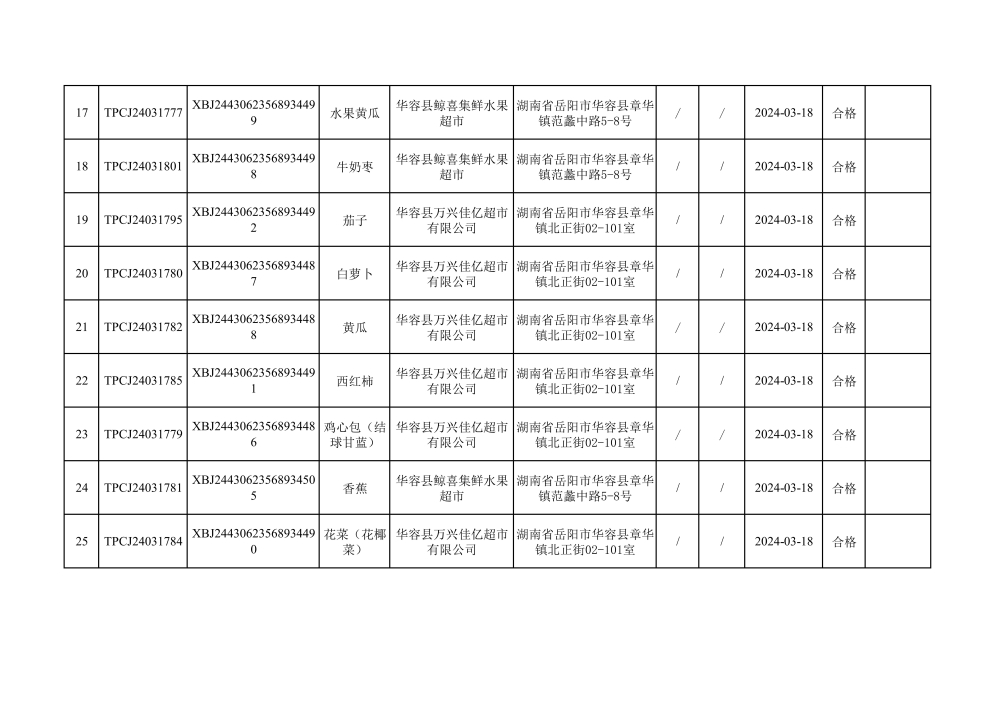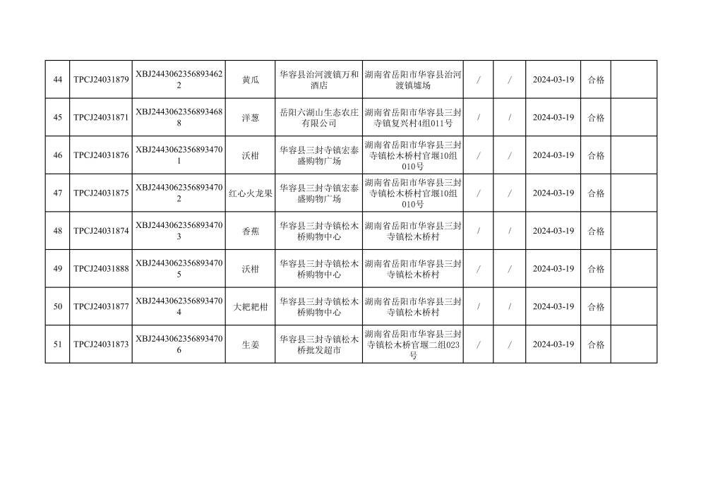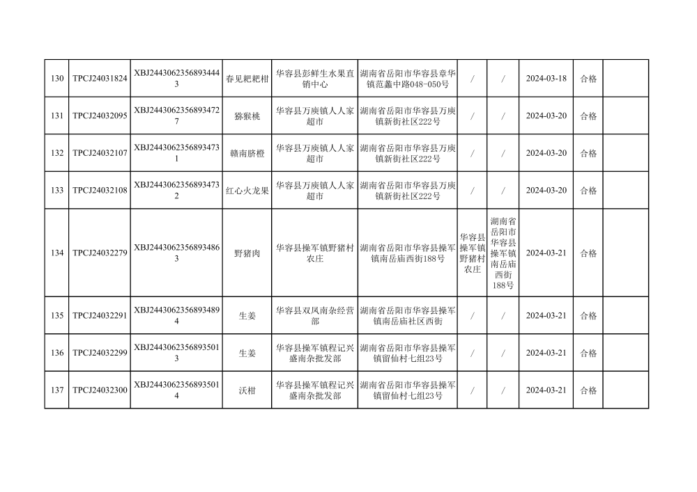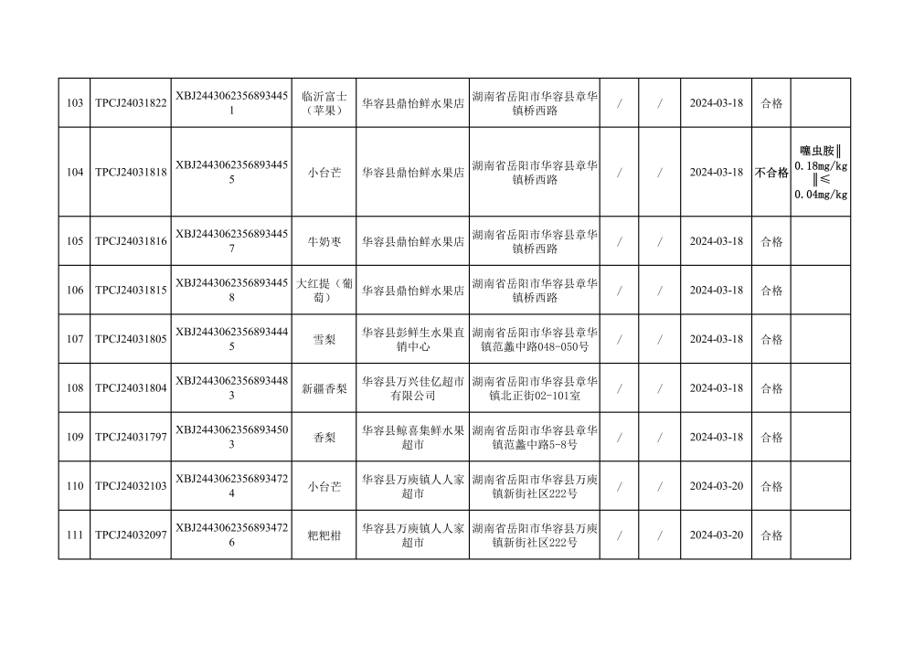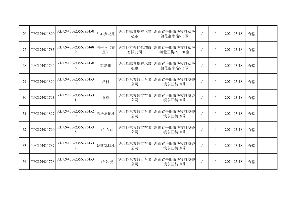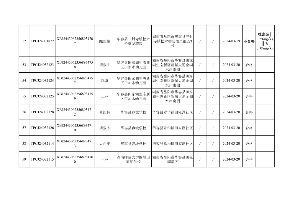 华容县市场监督管理局2024年第一季度农产品专项抽检结果汇总(共150批次)