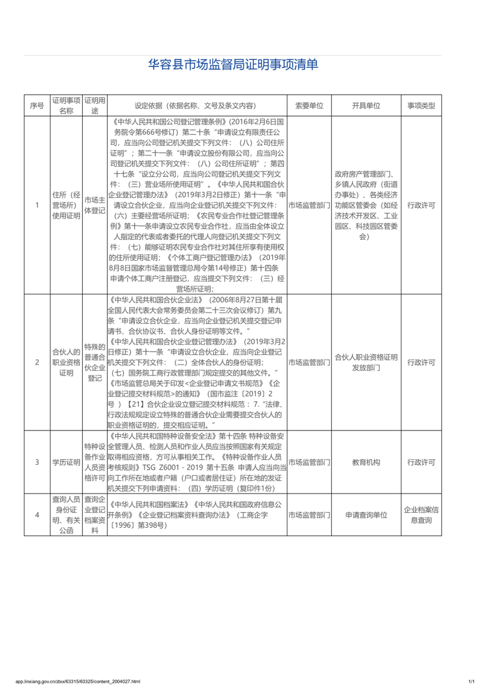 华容县市场监督局证明事项清单