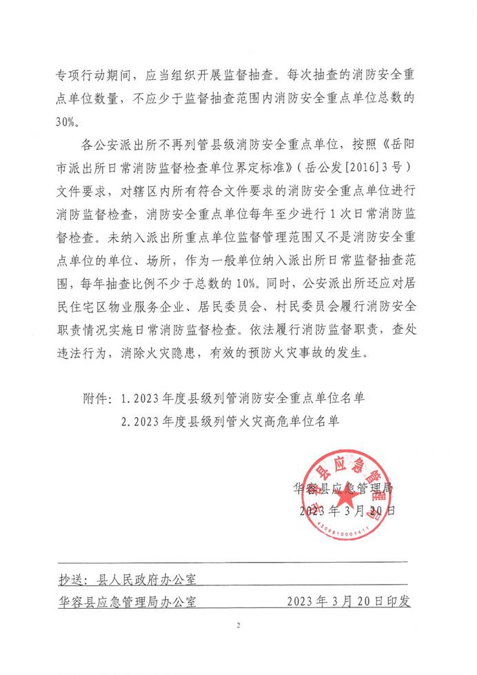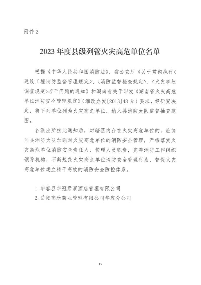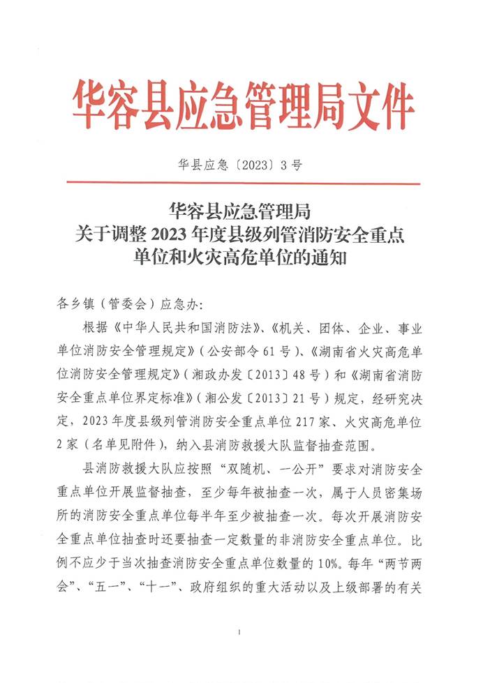 关于调整 2023 年度县级列管消防安全重点单位和火灾高危单位的通知