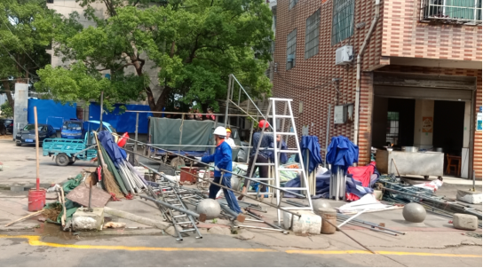 整治过程中,该办组织乡镇属地、自然资源局、行政执法大队等部门工作人员,召开专题会议,做到统一指挥、统一行动、统一队伍、统一标识、统一执法,积极配合、相互协作,形成合力。还组织志愿者依法取缔违规设置或自发形成的马路市场,依法清除违法建设的雨棚、标牌、摊点等,共计拆除各类棚亭、铁棚12处800余平方米。