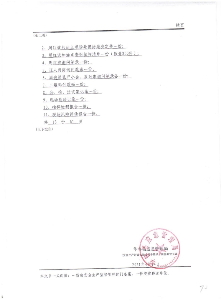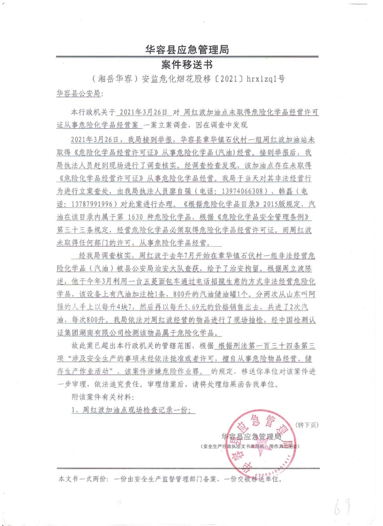 周红波加油点未取得危险化学品经营许可证从事危险化学品经营案件移送书