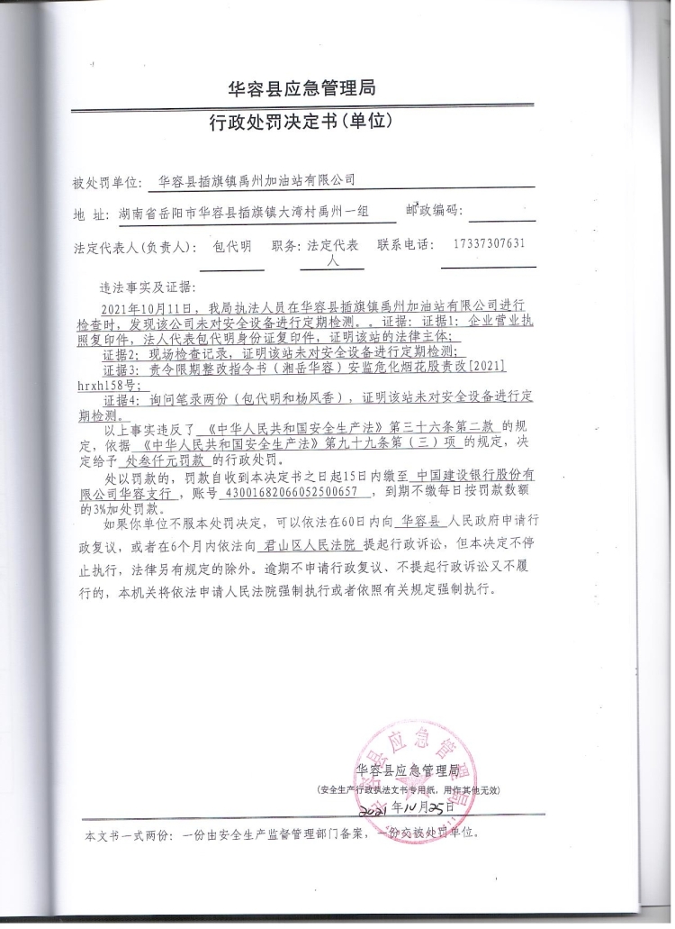 华容县插旗镇禹洲加油站有限公司行政处罚