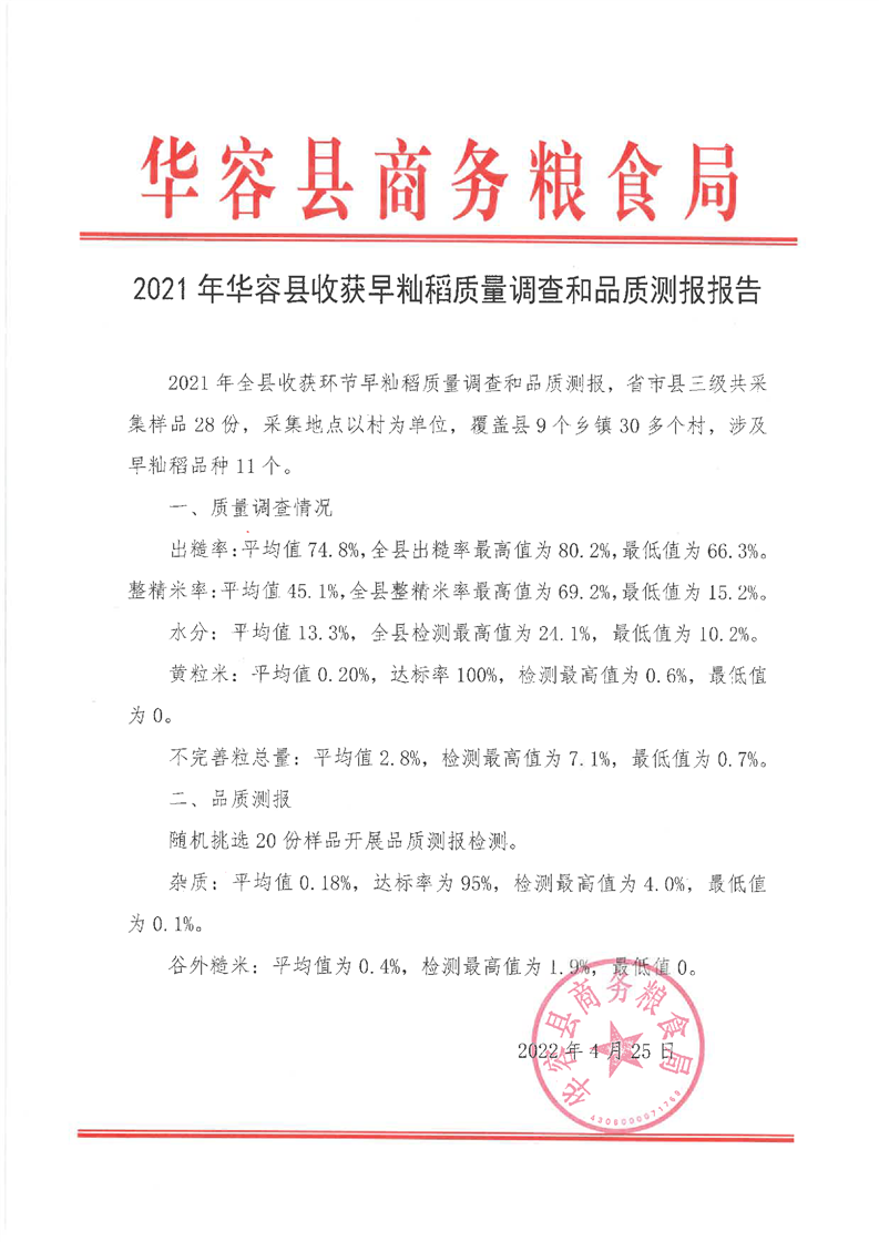 2021年华容县收获早籼稻质量调查和品质测报报告