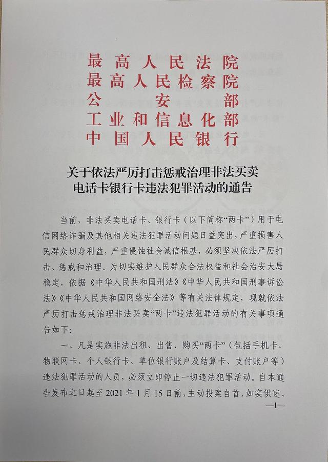 关于依法严厉打击惩戒治理非法买卖电话卡银行卡违法犯罪活动的通告