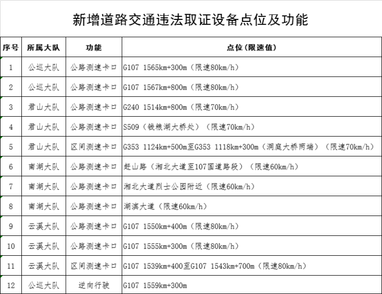 为进一步推动城市交通综合整治,规范道路交通秩序,提升城市管理水平,依据《中华人民共和国道路交通安全法》《湖南省实施〈中华人民共和国道路交通安全法〉办法》等法律法规规定,岳阳市公安局交通警察支队决定在辖区增设一批道路交通违法取证设备。现将新增的道路交通违法取证设备予以通告,自2020年9月3日起施行。