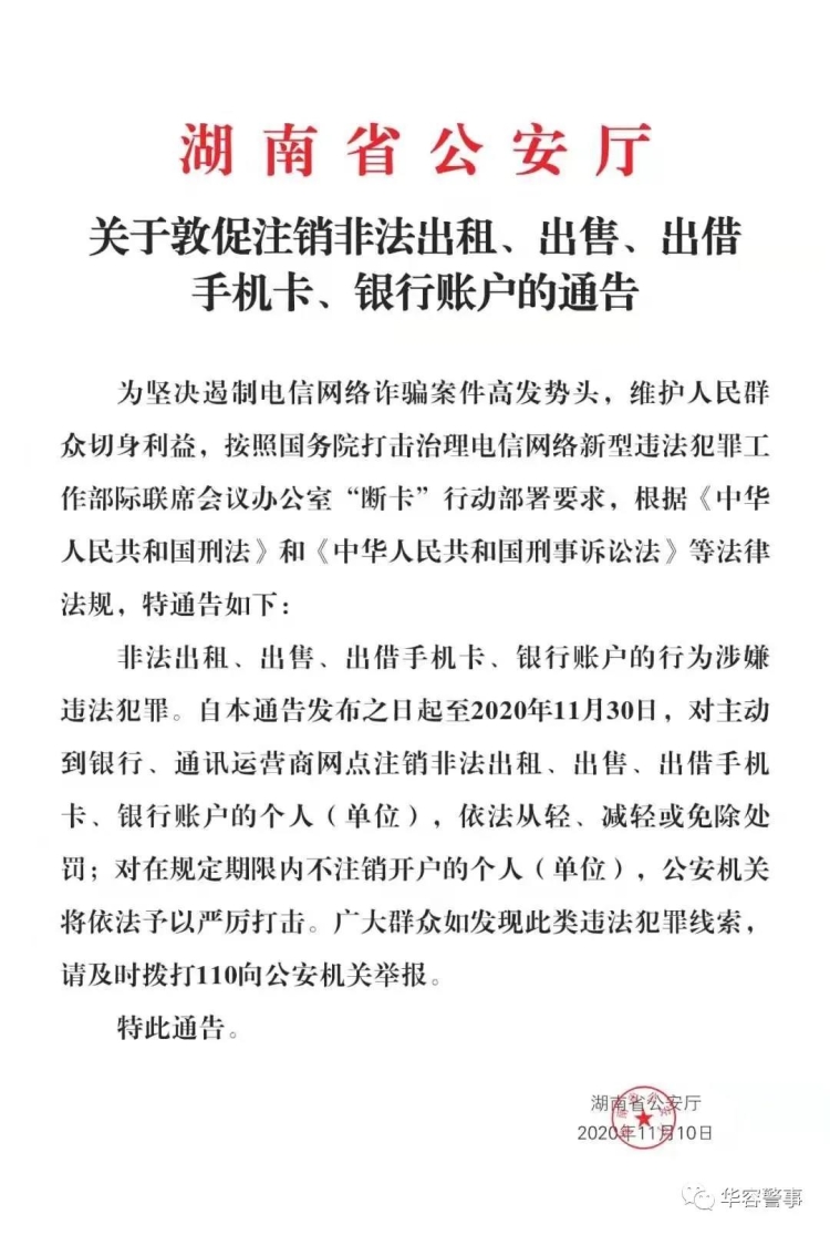 关于敦促注销非法出租、出售、出借手机卡、银行账户的通告