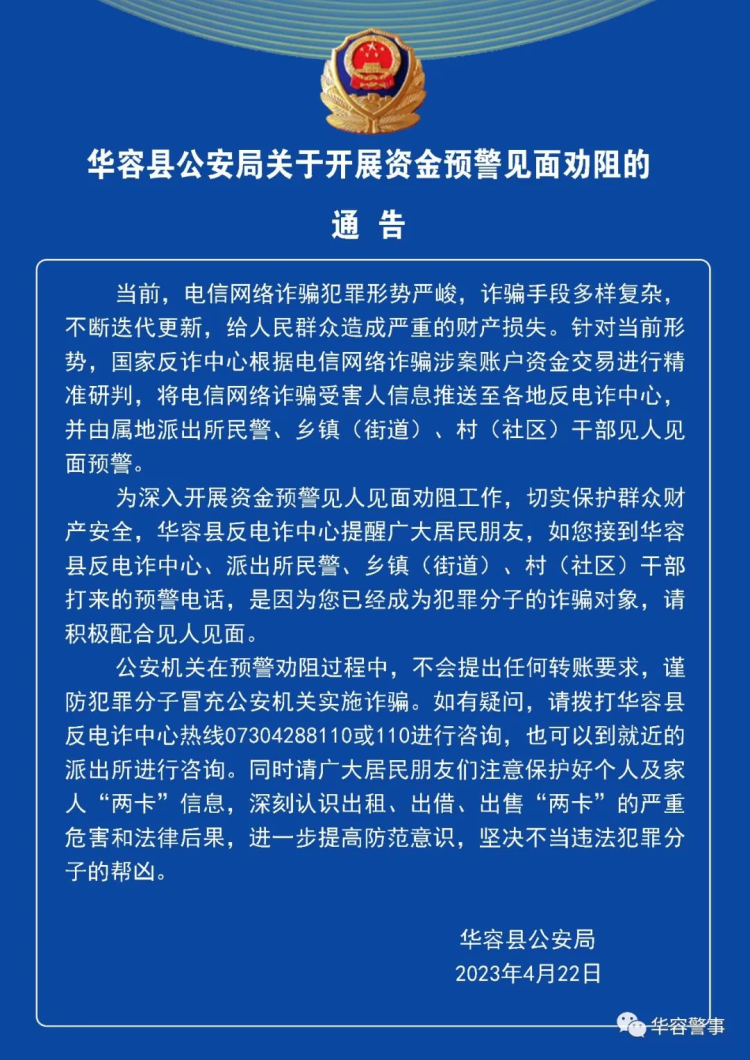 华容县公安局关于开展资金预警见面劝阻的通告