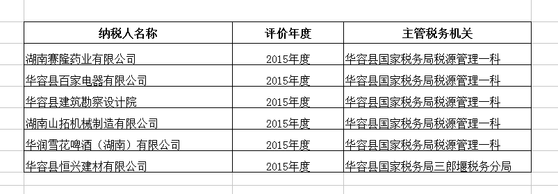 华容县国家税务局2015年度纳税信用等级A级纳税人名单公示