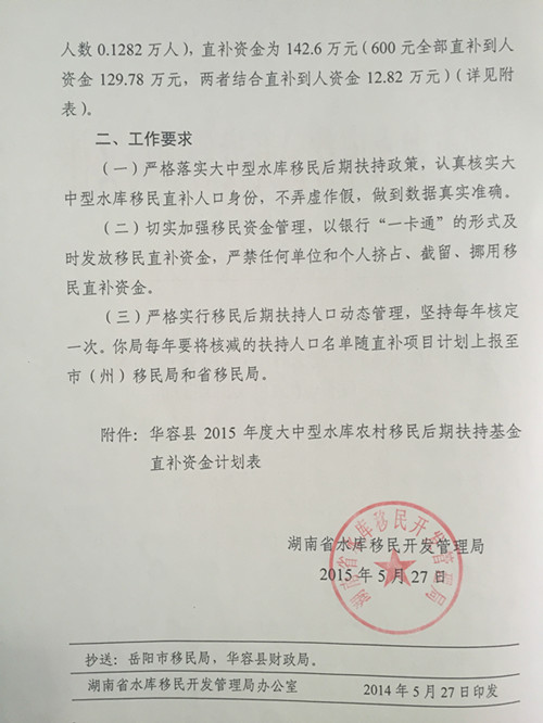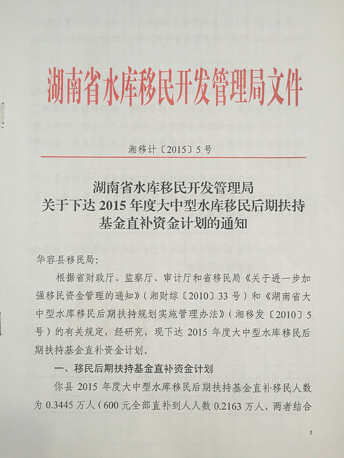 湖南省水库移民开发管理局关于下达2015年度大中型水库移民后期扶持基金直补资金计划的通知