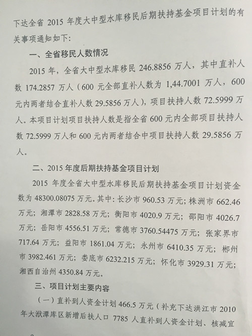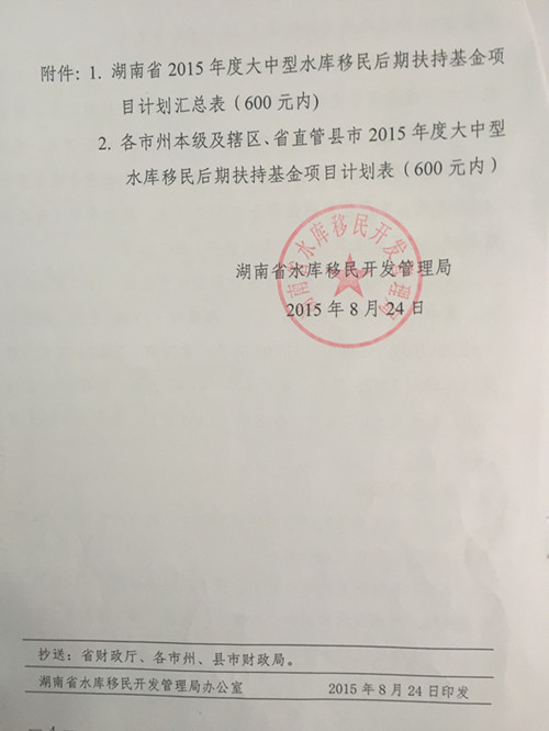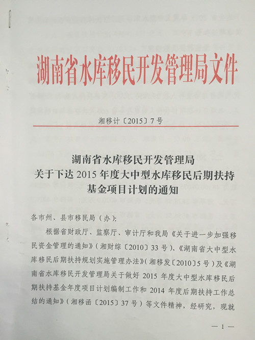 湖南省水库移民开发管理局关于下达2015年度大中型水库移民后期扶持基金项目计划的通知