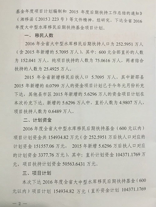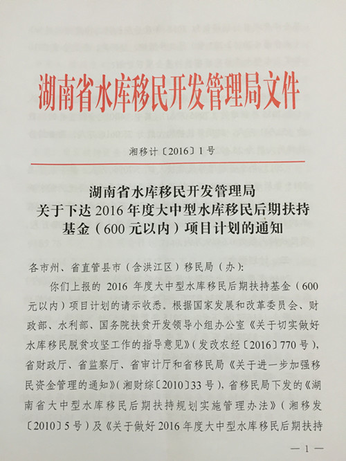 关于下达2016年度大中型水库移民后期扶持基金(600元以内)项目计划的通知