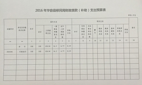 2016年华容县移民局财政拨款(补助)支出预算表