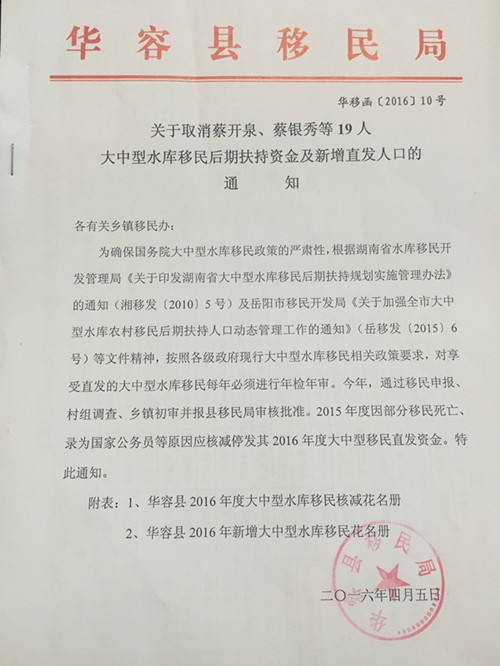 关于取消蔡开泉、蔡银秀等19人大中型水库移民后期扶持资金及新增直发人口的通知