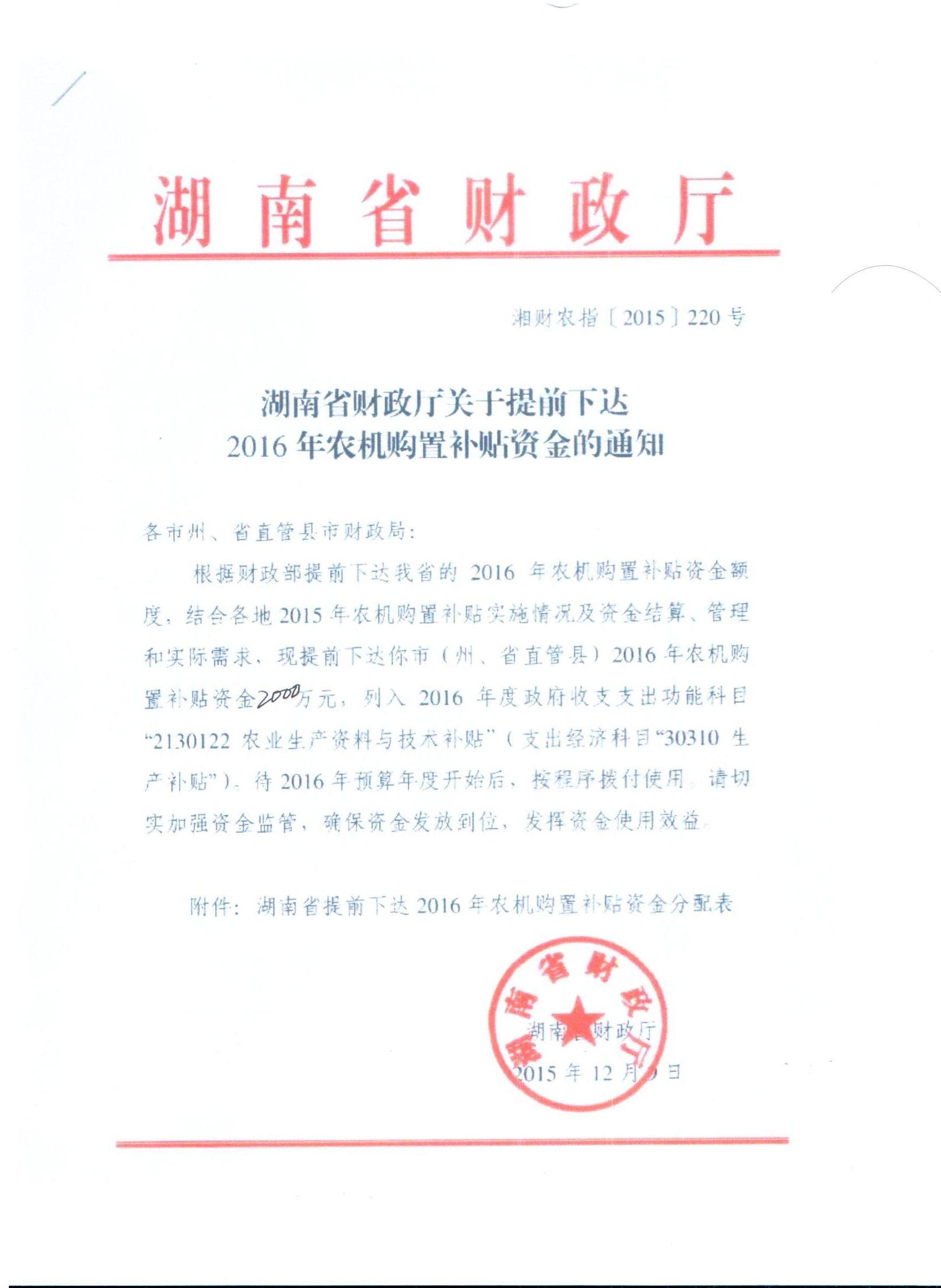 湖南省财政厅下达2016年农机购置补贴资金的通知