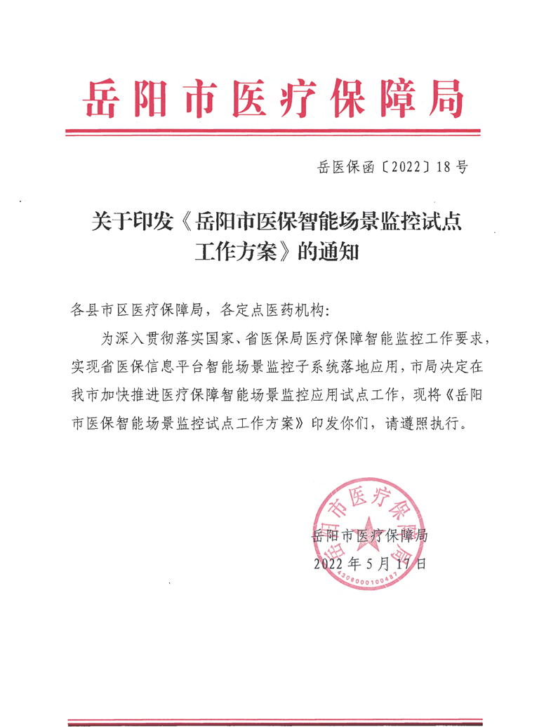 关于印发《岳阳市医保智能场景监控试点工作方案》的通知
