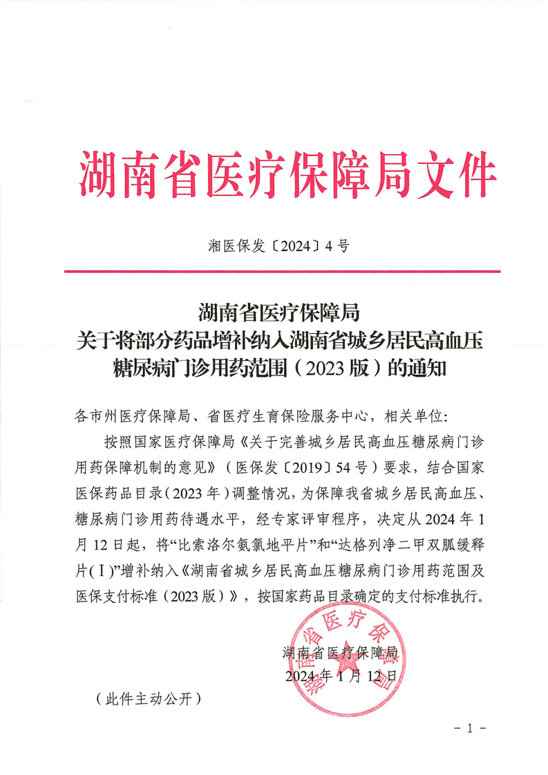 湘医保发〔2024〕4号-关于将部分药品增补纳入湖南省城乡居民高血压糖尿病门诊用药范围(2023版)的通知
