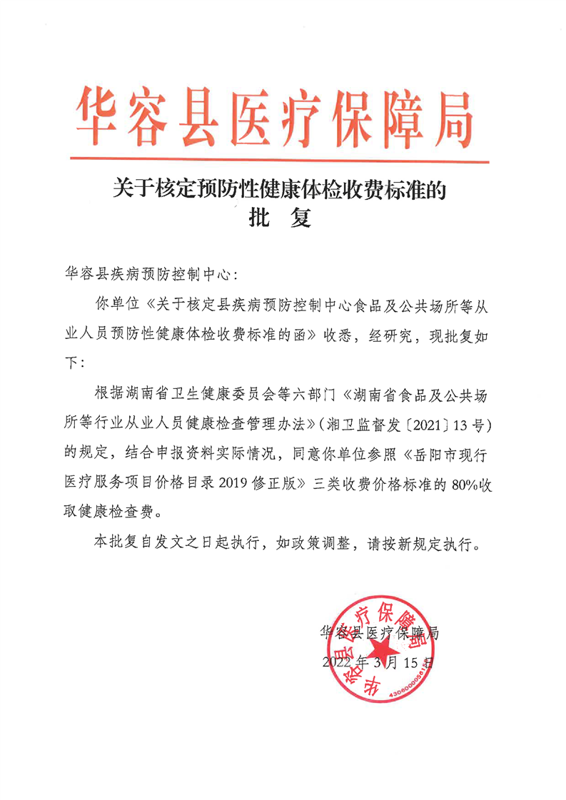 关于核定预防性健康体检收费标准的批复