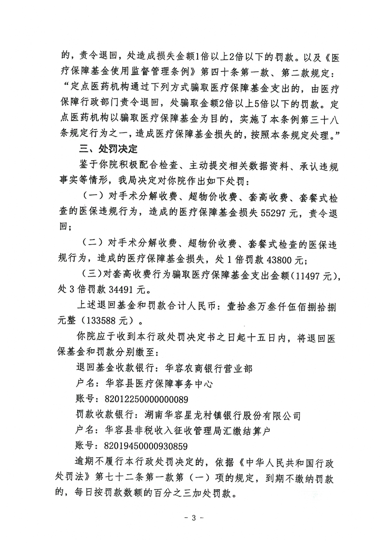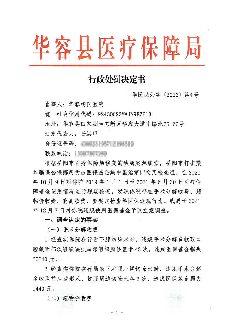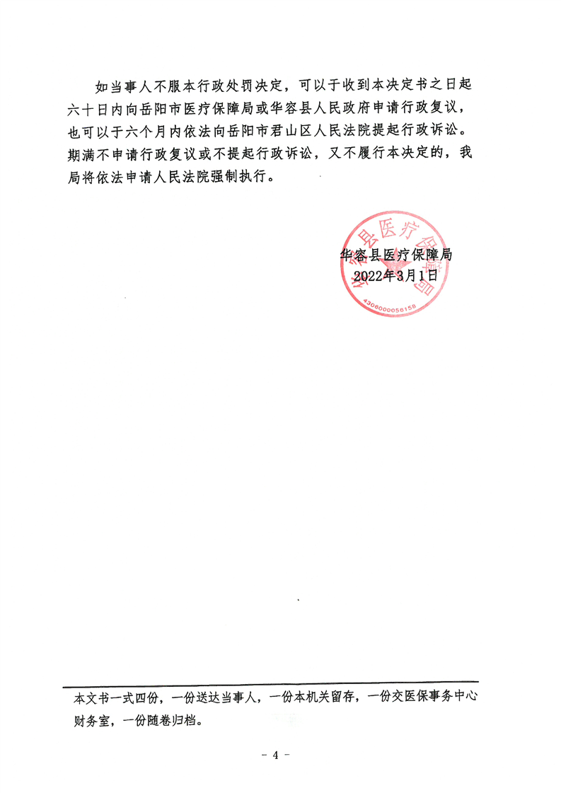 华容杨氏医院违规使用医保基金行政处罚决定书(华医保处字【2022】(第4号))