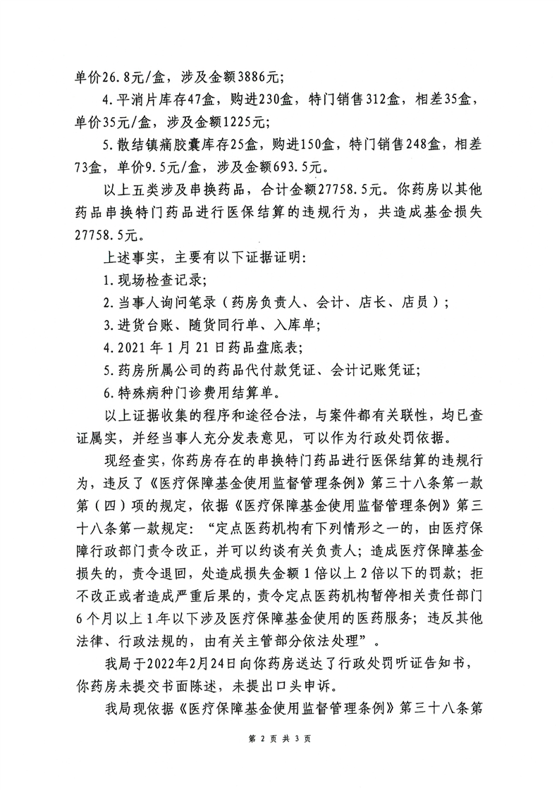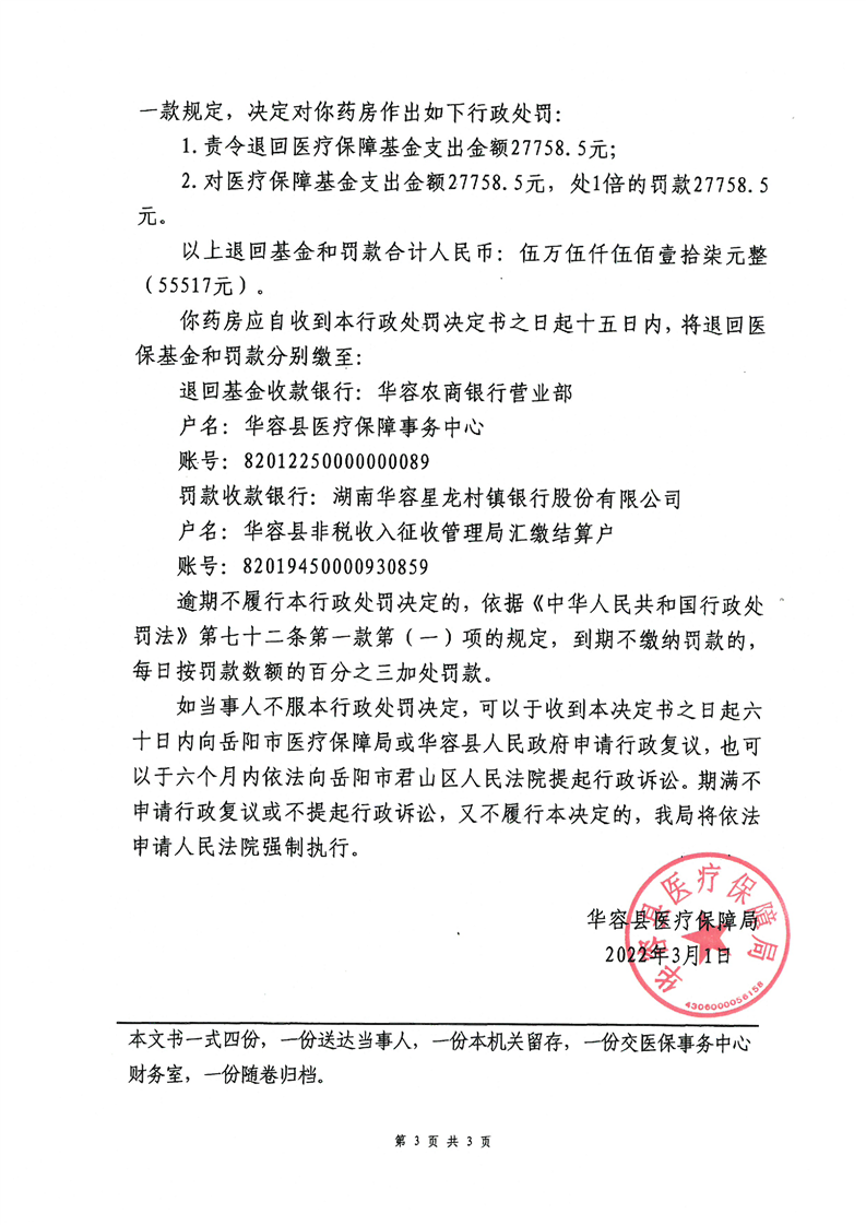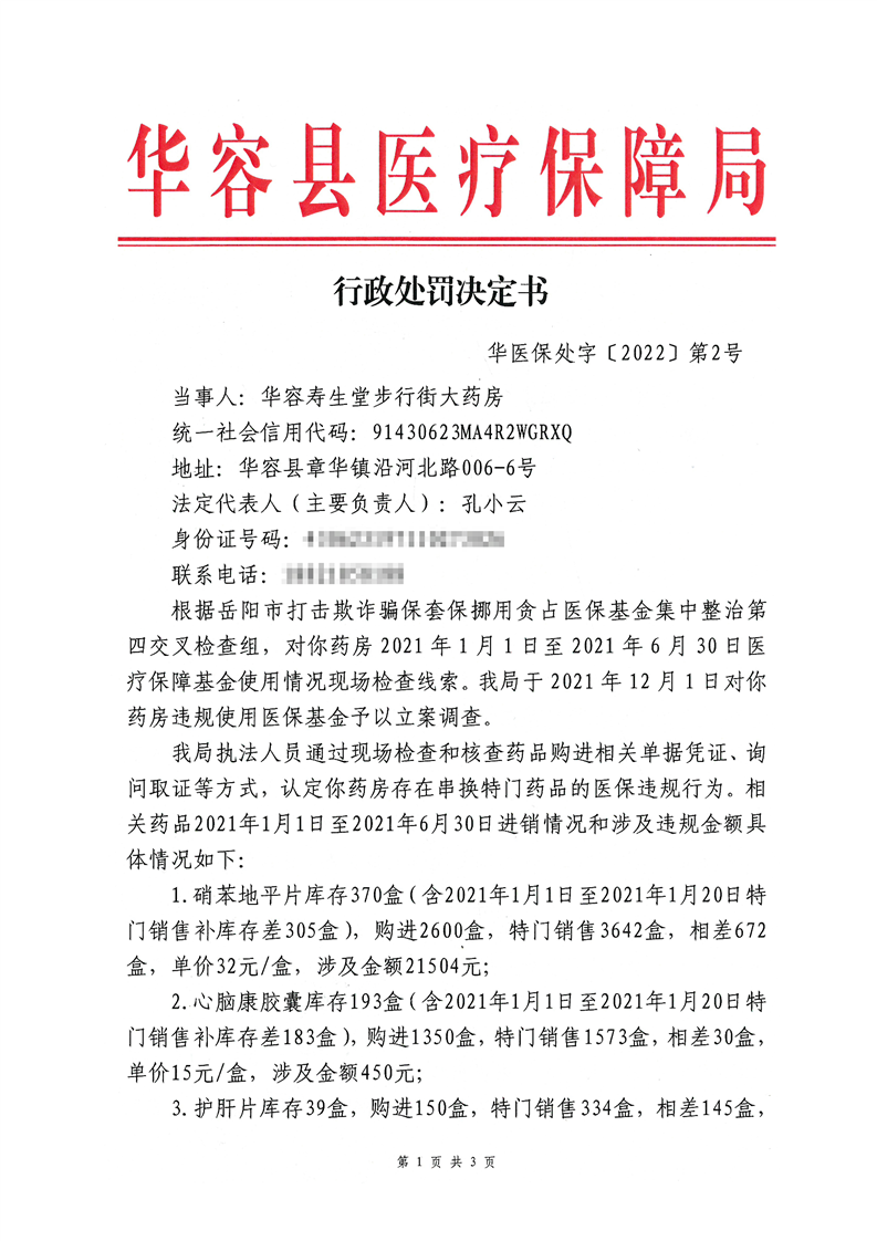 华容寿生堂步行街大药房违规使用医保基金行政处罚决定书(华医保处字【2022】(第2号))