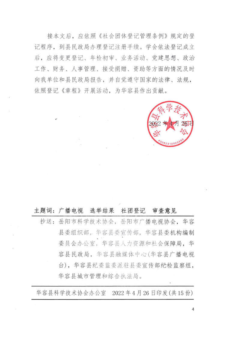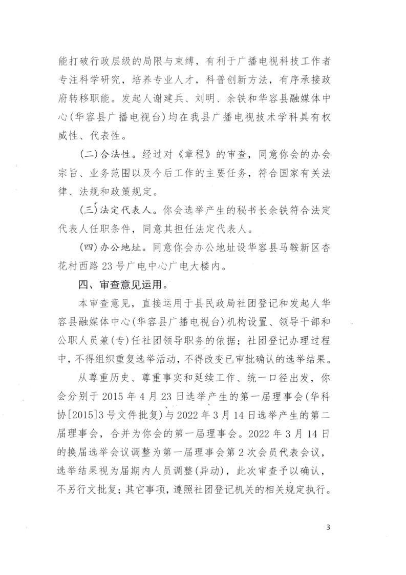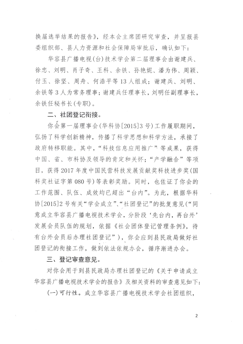 关于华容县广播电视(台)技术学会登记衔接暨同意成立华容县广播电视技术学会的审查意见