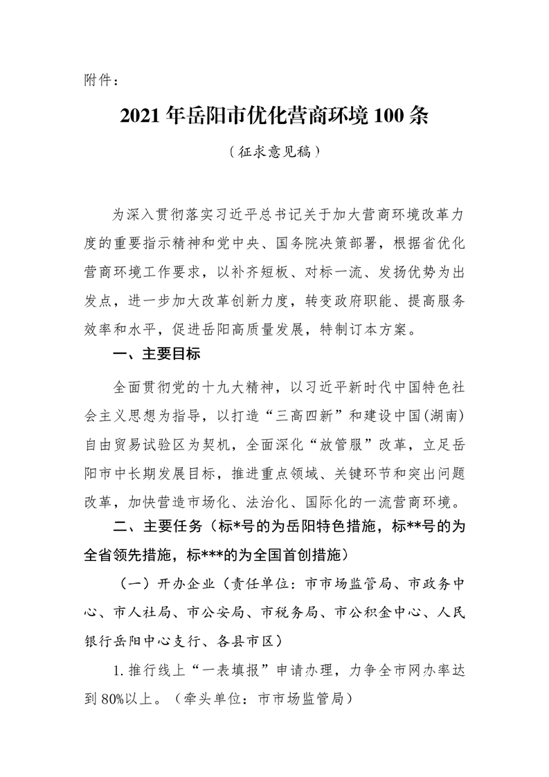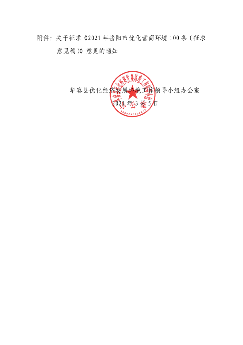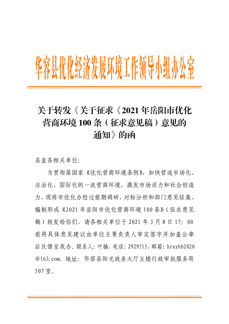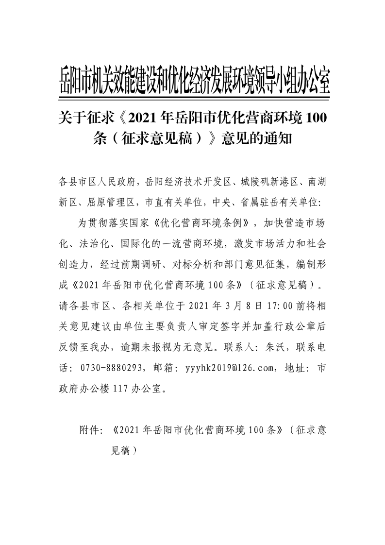 关于转发《关于征求《2021 年岳阳市优化营商环境 100 条(征求意见稿)意见的通知》的函