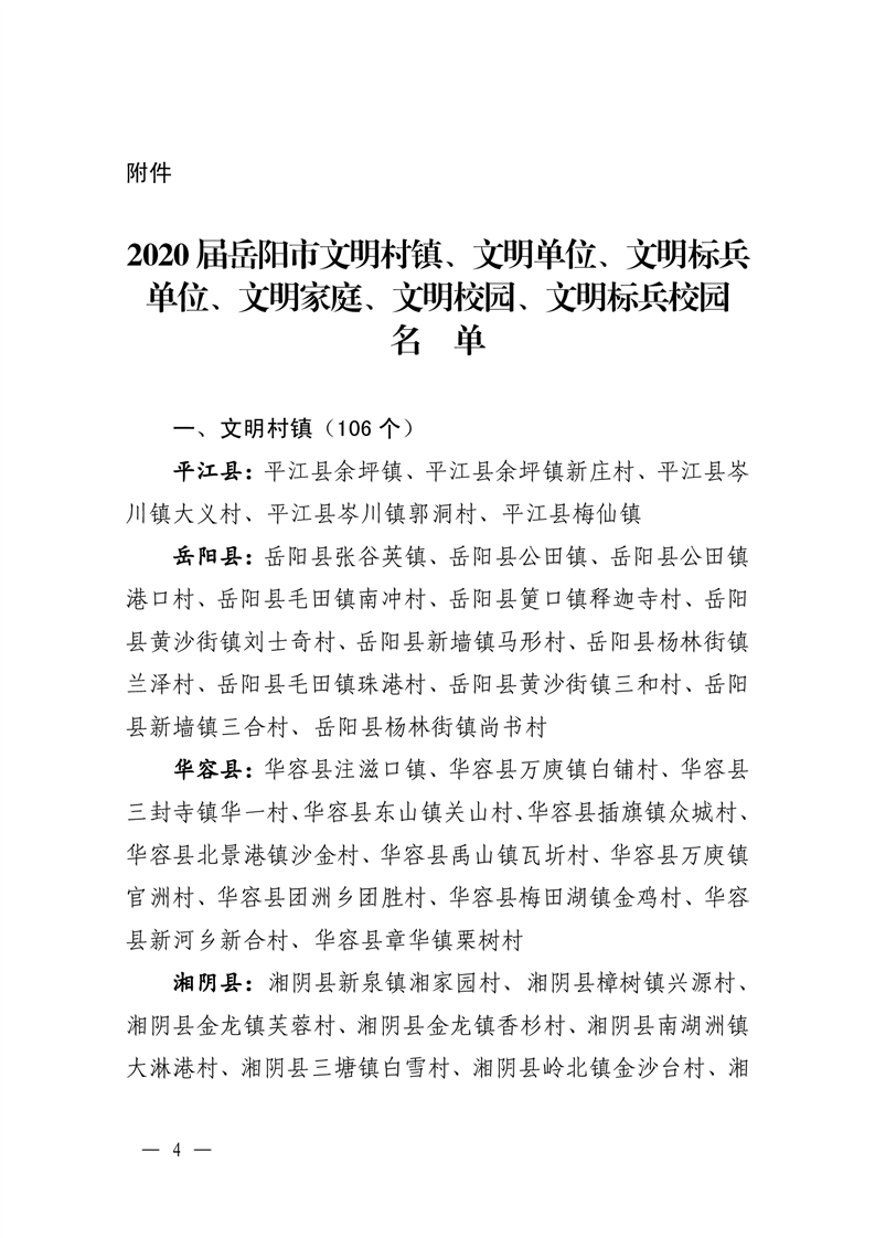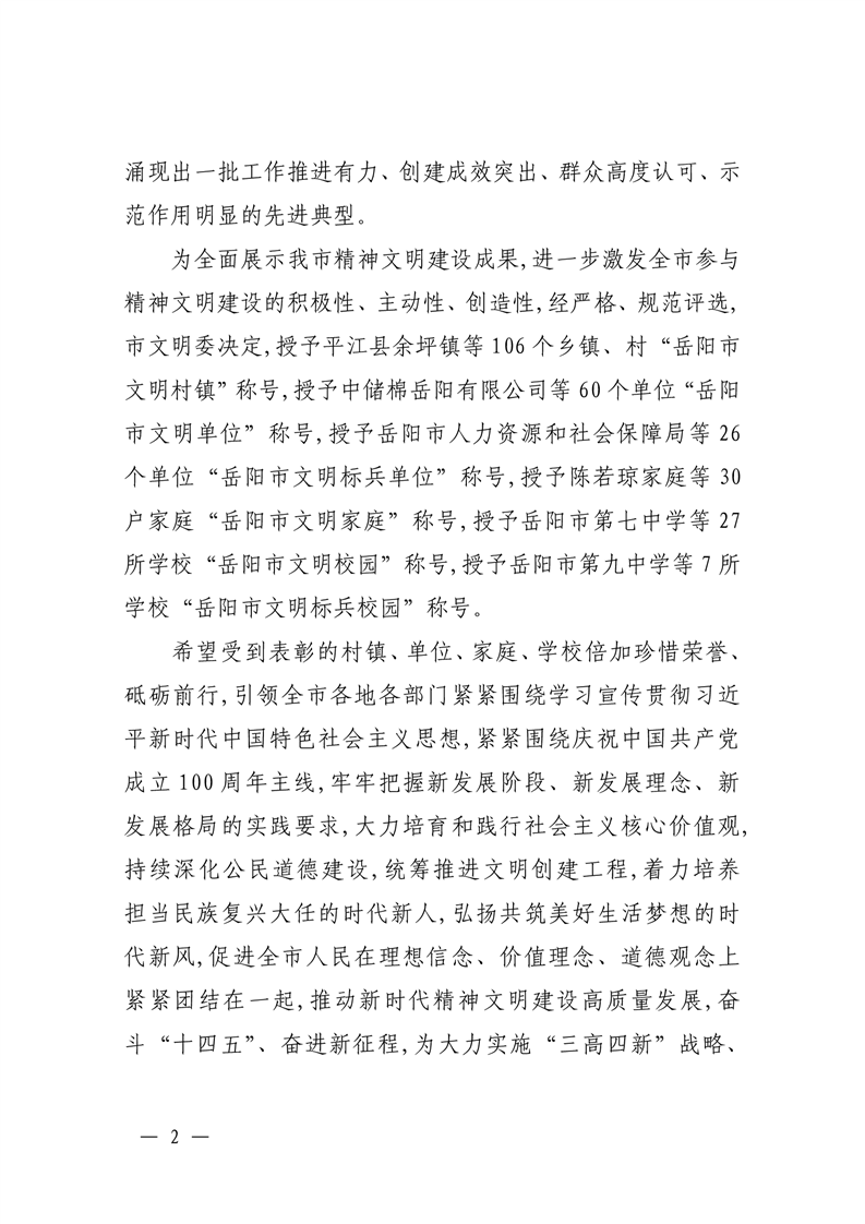 关于表彰 2020 届岳阳市文明村镇、文明 单位、文明标兵单位、文明家庭、文明 校园、文明标兵校园的决定