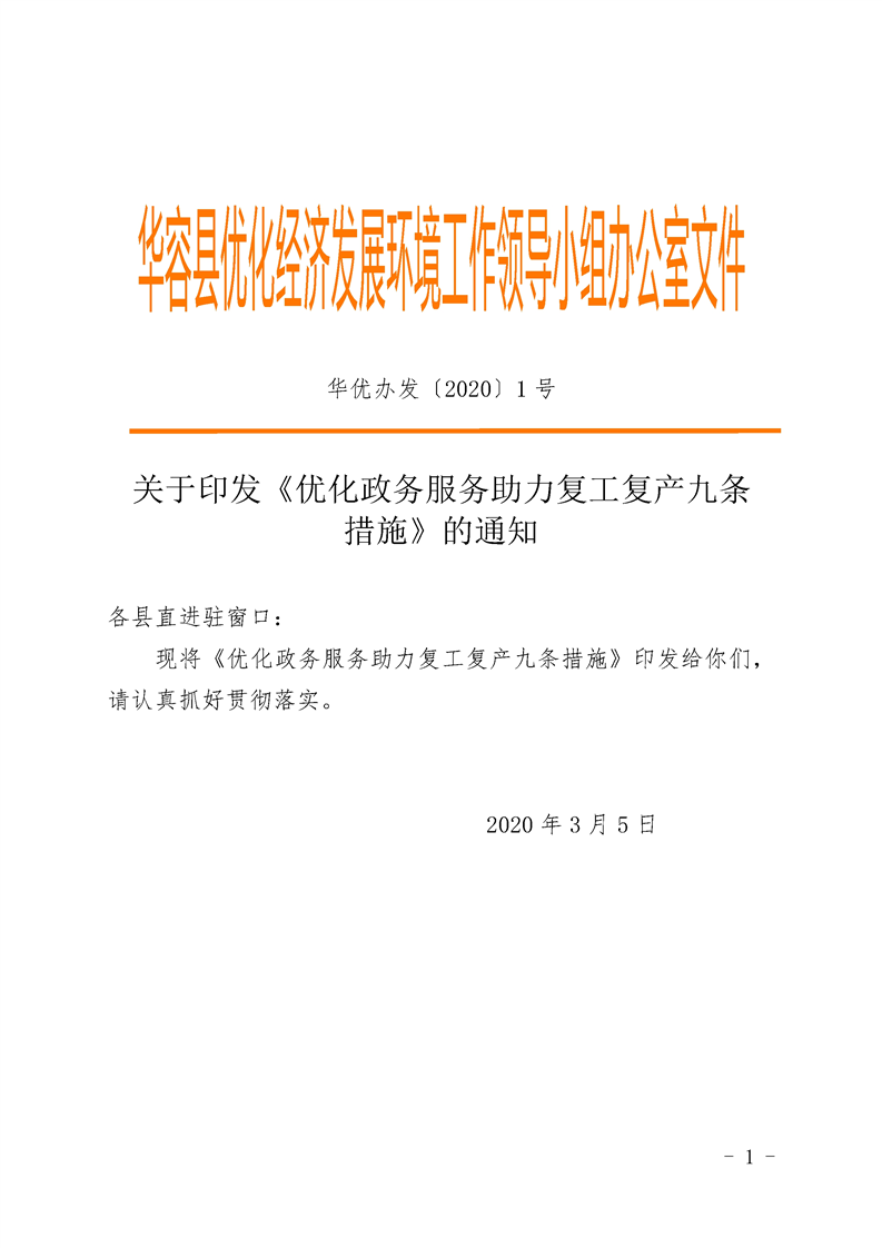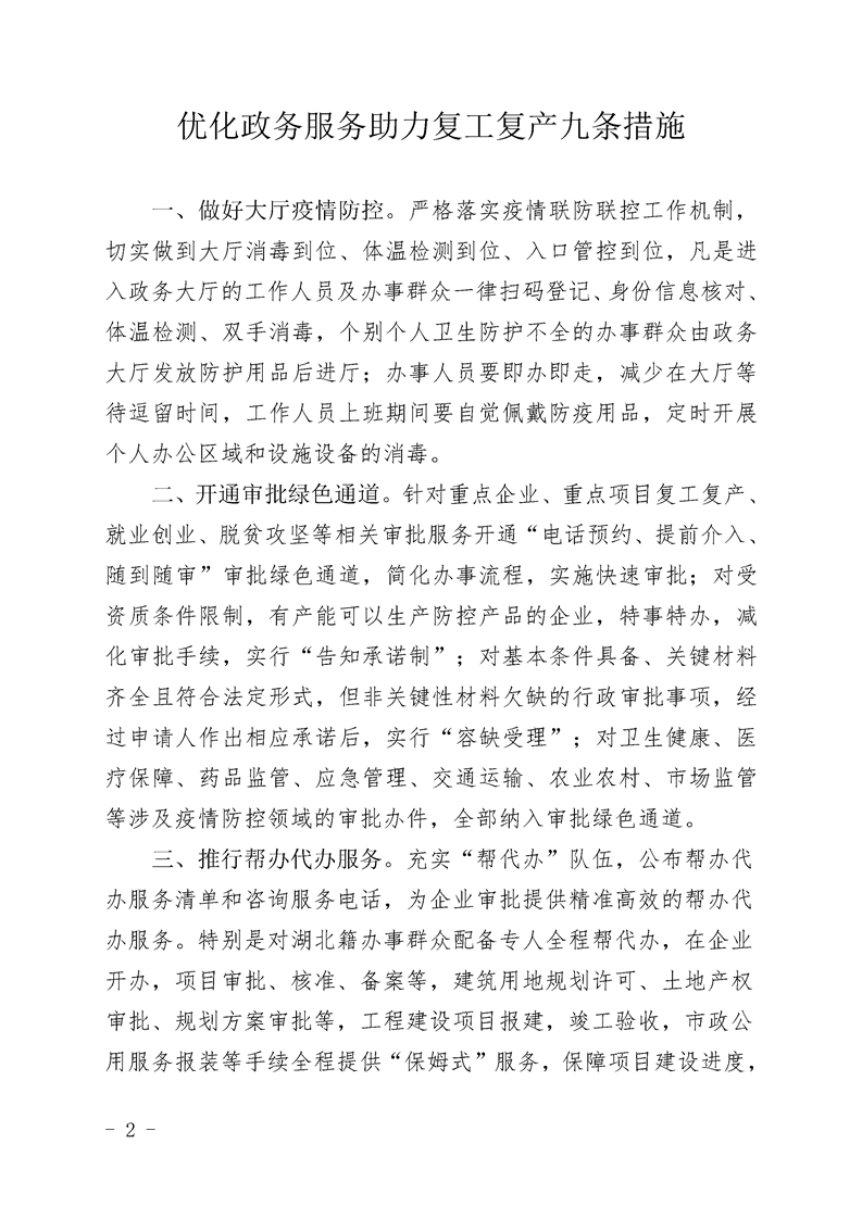 关于印发《优化政务服务助力复工复产九条 措施》的通知