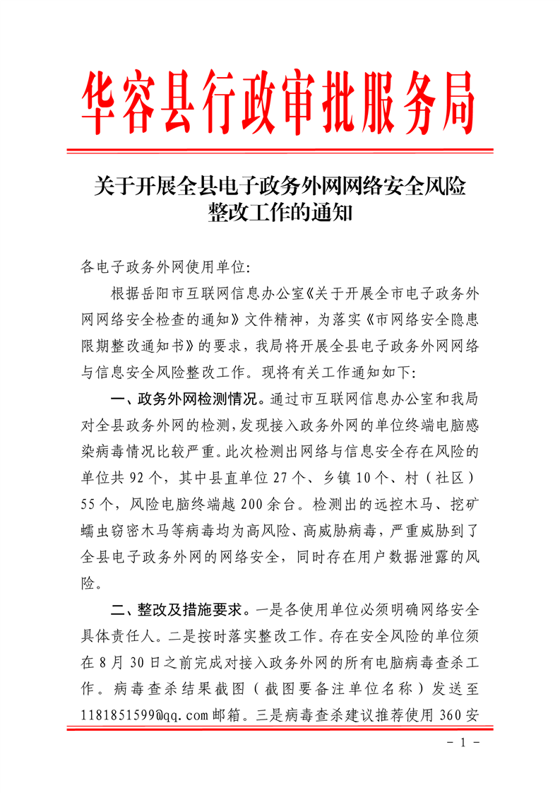 关于开展全县电子政务外网网络安全风险整改工作的通知