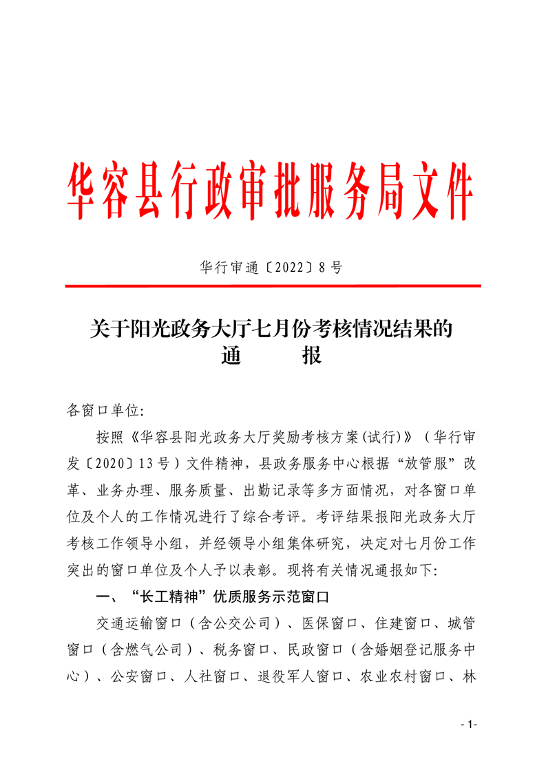 关于阳光政务大厅七月份考核情况结果的通报
