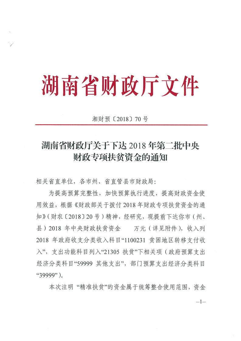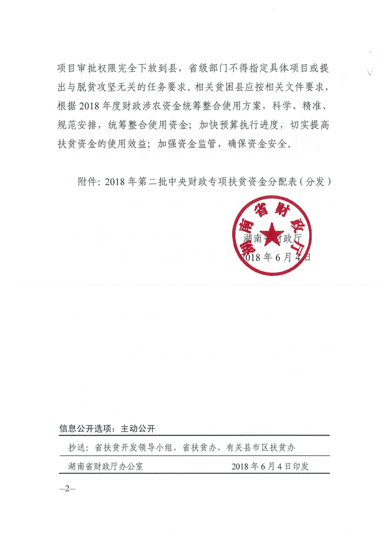 湖南省财政厅关于下达2018年第二批中央财政专项扶贫资金的通知