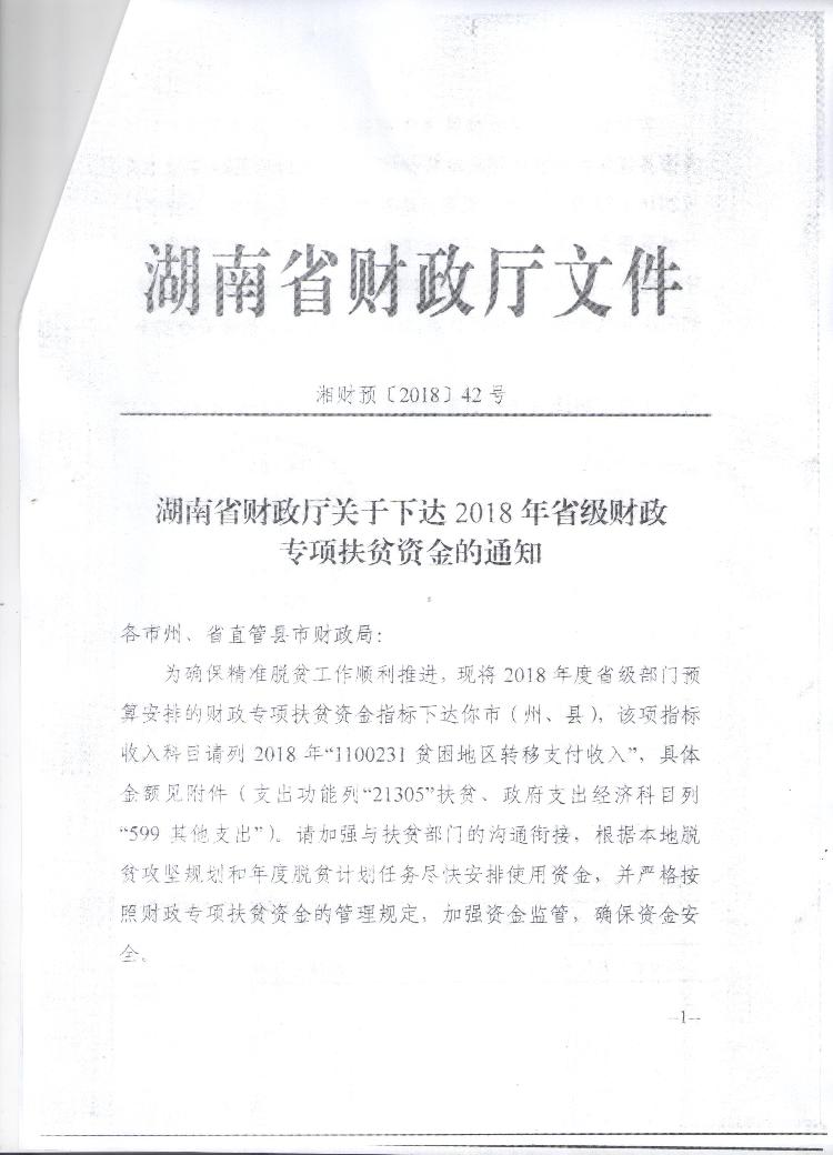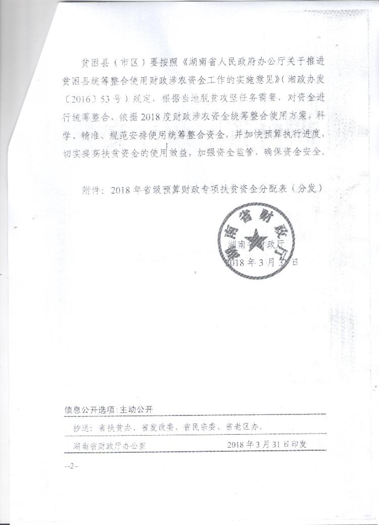 湖南省财政厅关于下达2018年省级财政专项扶贫资金的通知