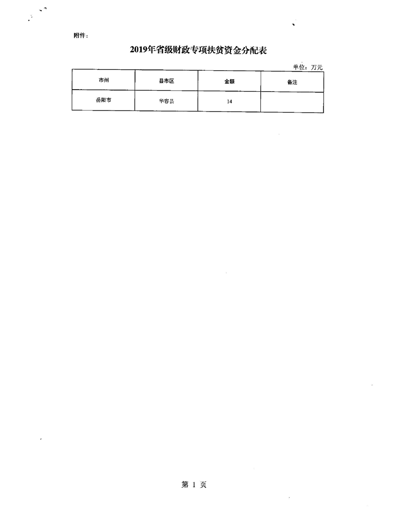 湘财预[2019]92号:湖南省财政厅关于下达2019年省级财政专项扶贫资金的通知](14万元)