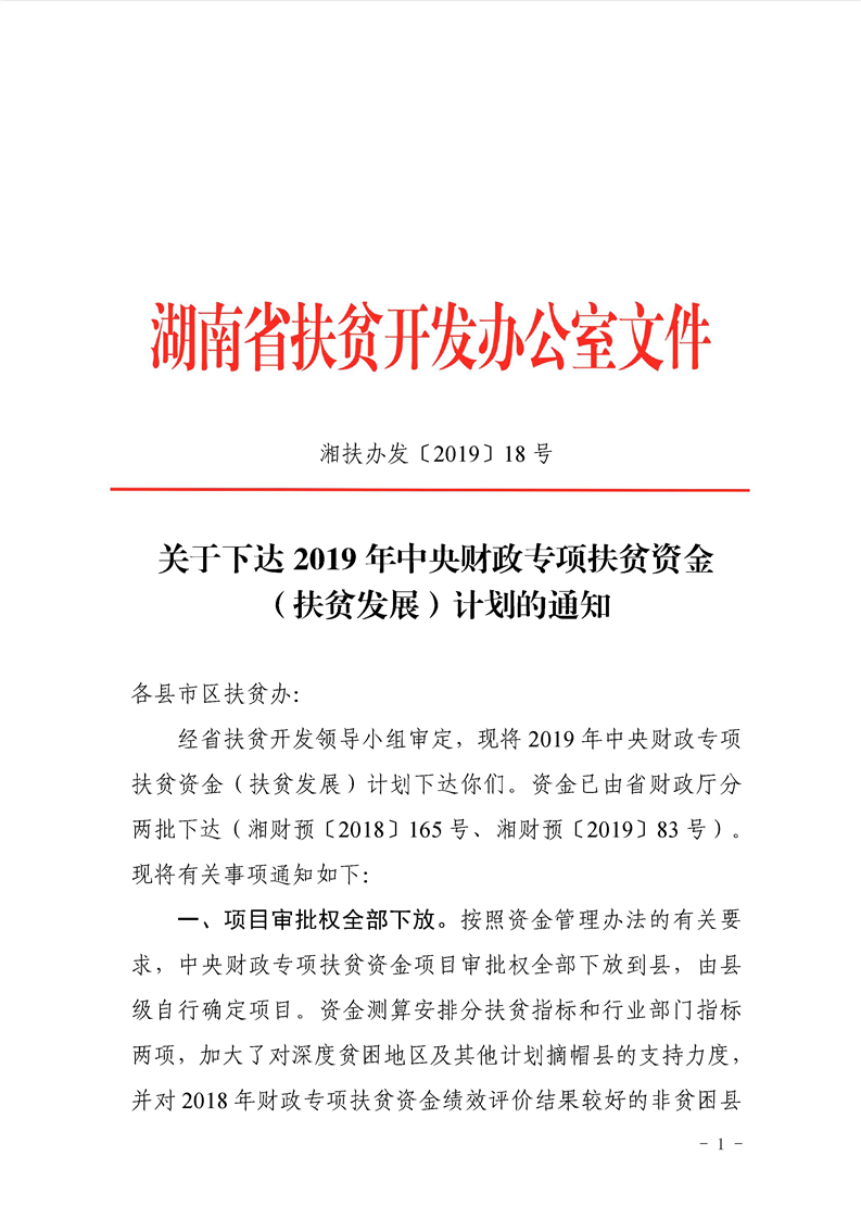 湘扶办发〔2019〕18 号:关于下达2019年中央财政专项扶贫资金(扶贫发展)计划的通知(348万)