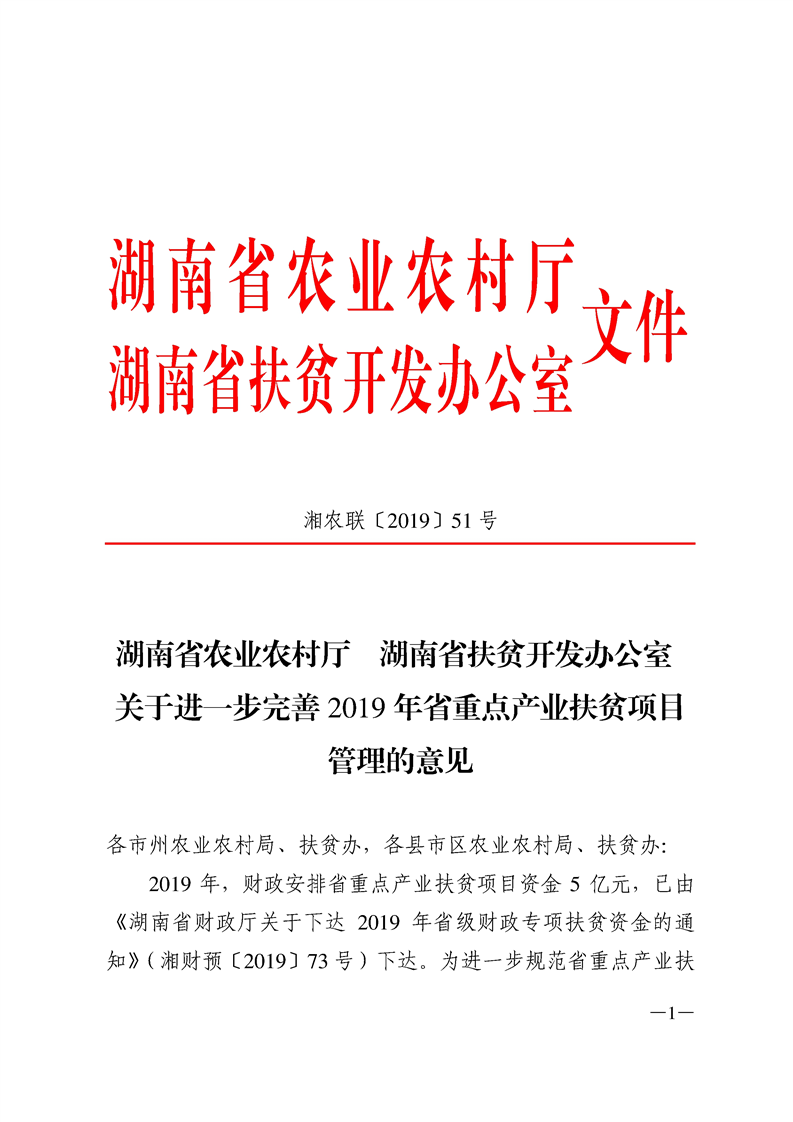 湘农联【2019】51号湖南省农业农村厅 湖南省扶贫开发办公室 《关于进一步完善2019年省重点产业扶贫项目管理的意见》(220万)