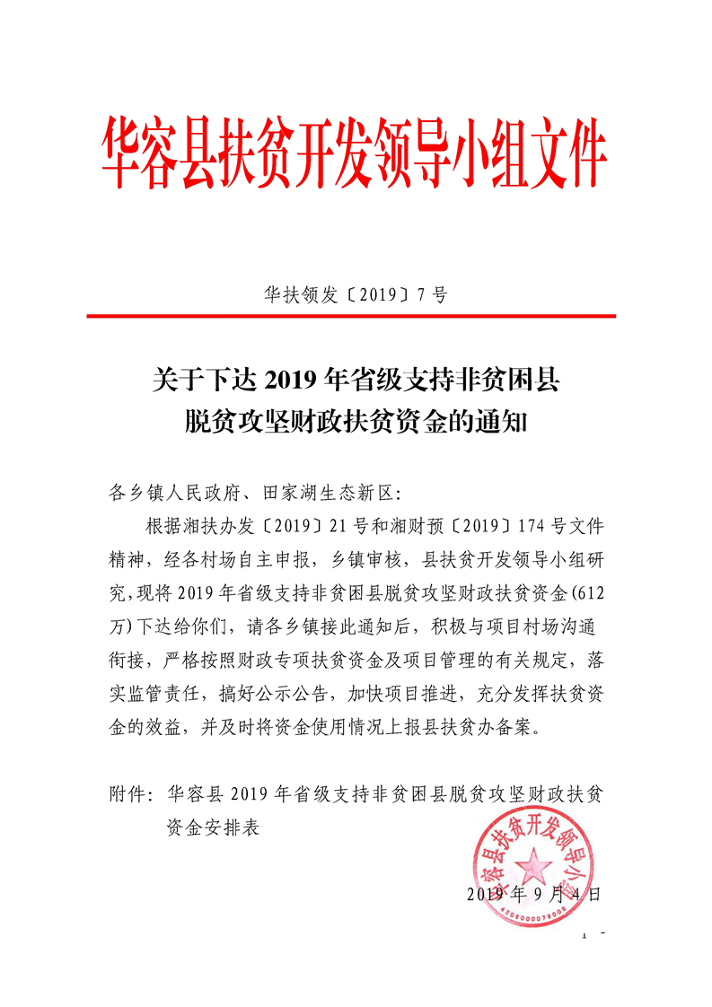 华扶领发(2019)7号:关于下达2019年省级支持非贫困县脱贫攻坚财政扶贫资金的通知--612万