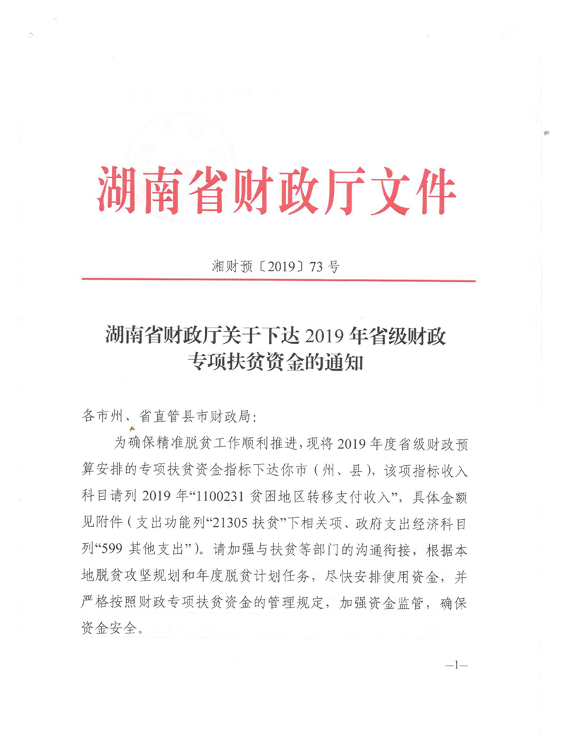 关于下达2019年省级财政专项扶贫资金的通知--2911万元