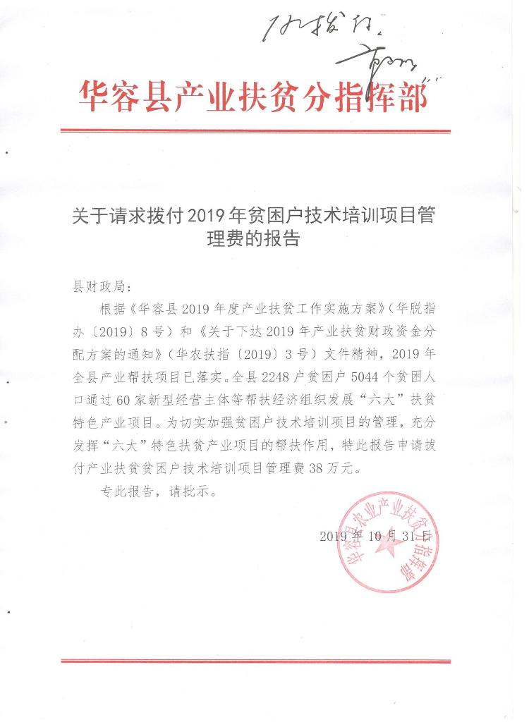 2019年华容县贫困户技术培训项目管理费--38万(县级)