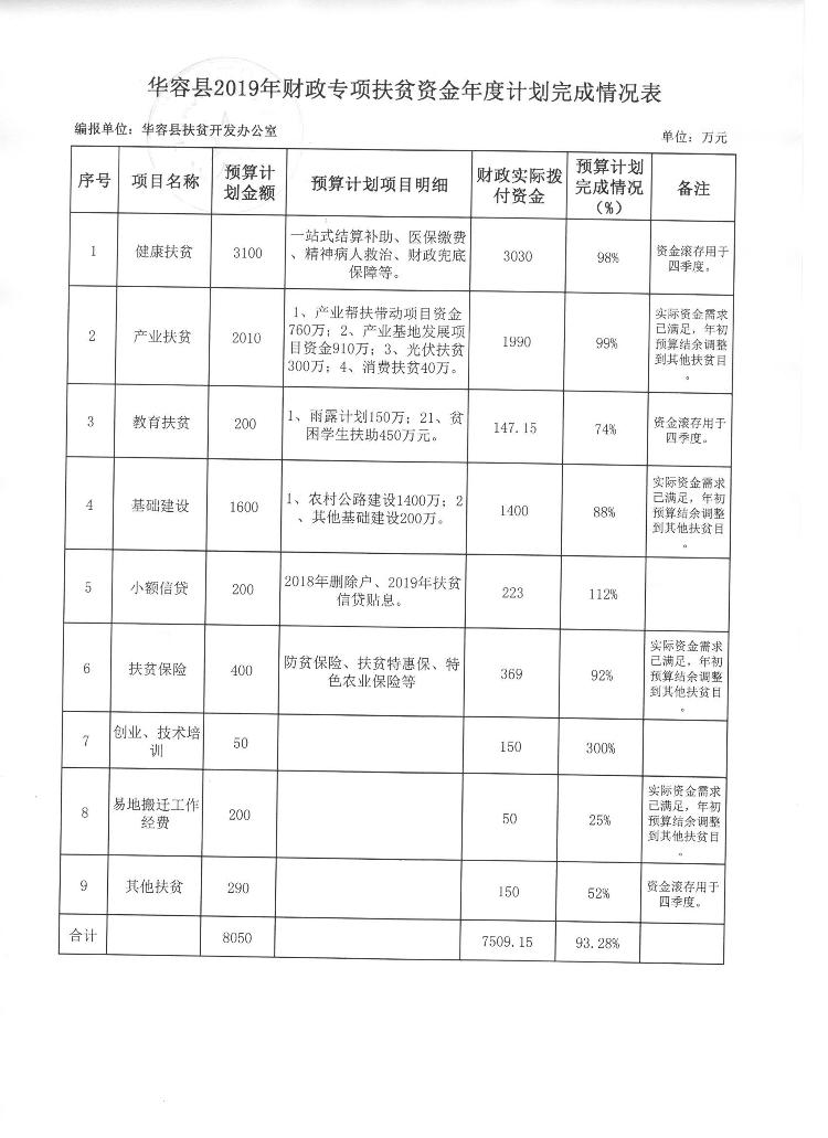 2019年华容县年度扶贫资金年度计划完成情况的公告