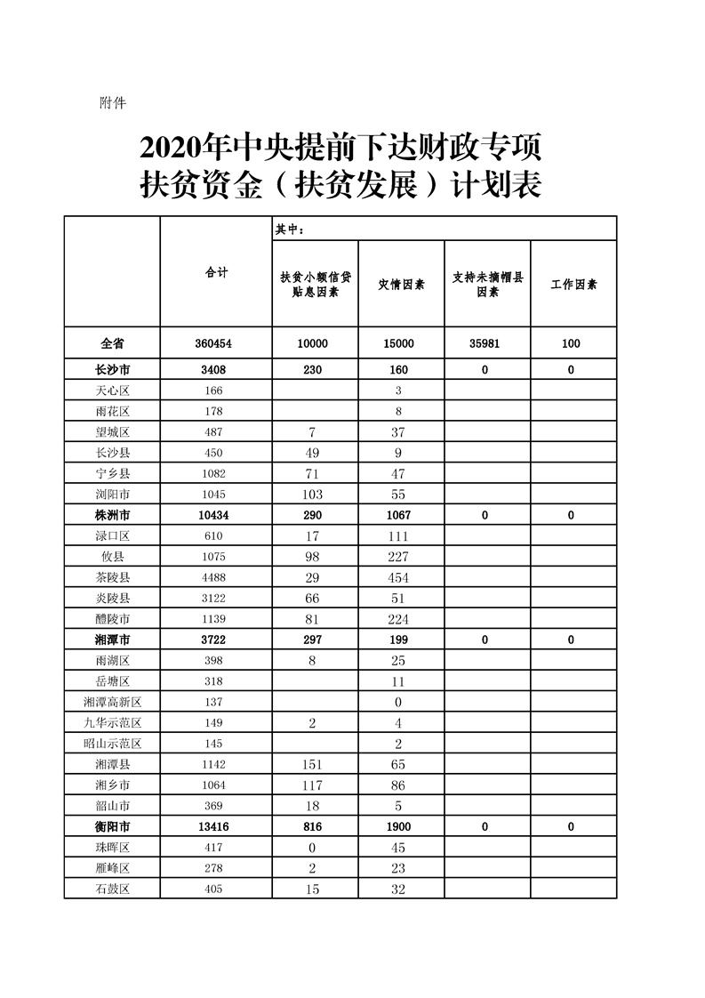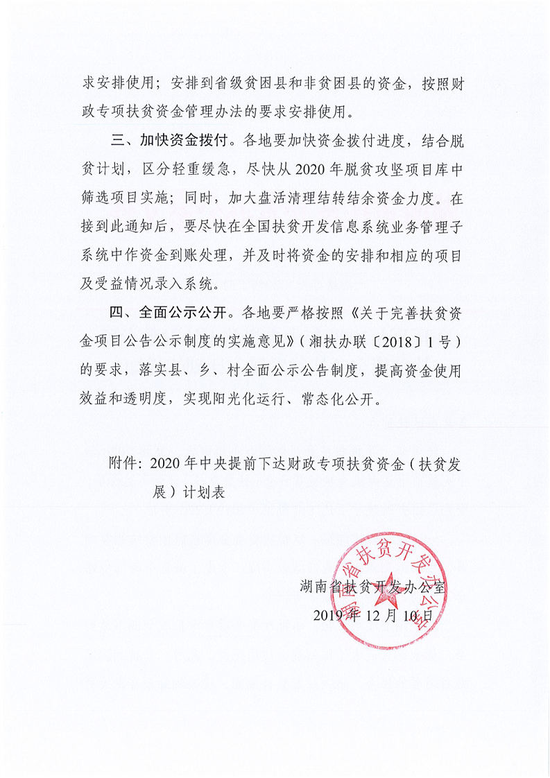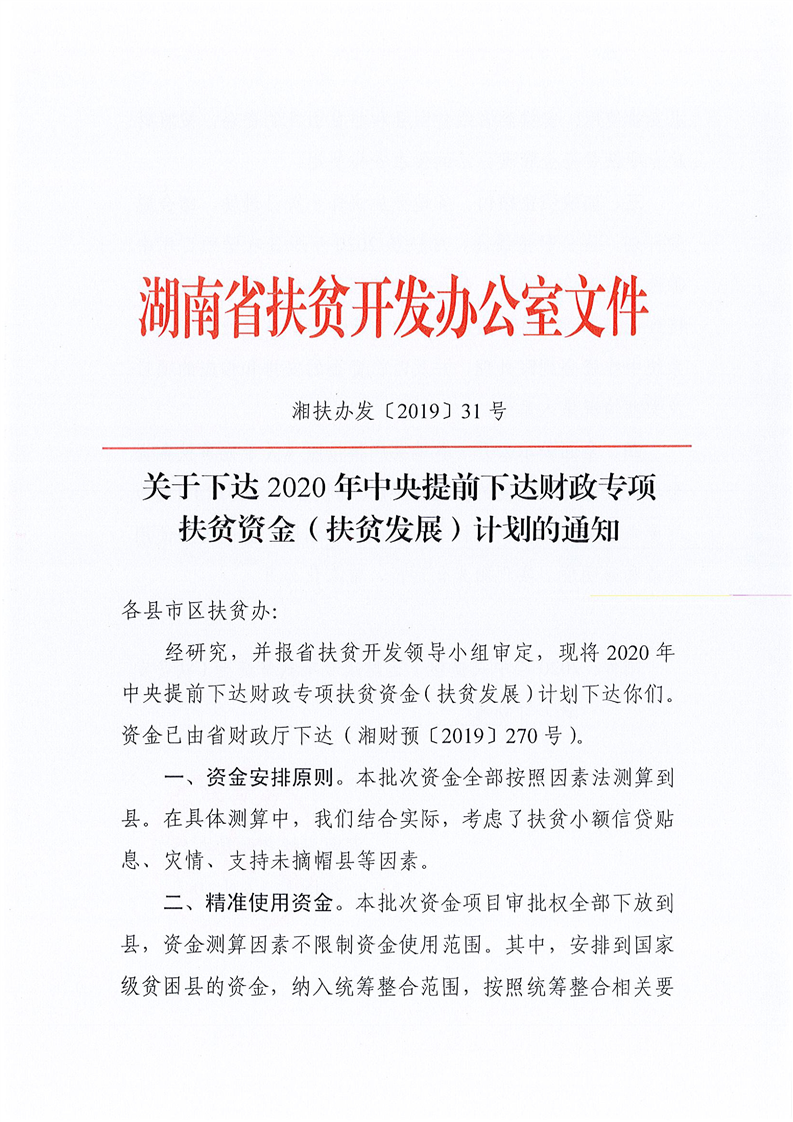 关于下达2020年中央提前下达财政专项扶贫资金(扶贫发展)计划的通知(湘扶办发〔2019〕31号)(843万)
