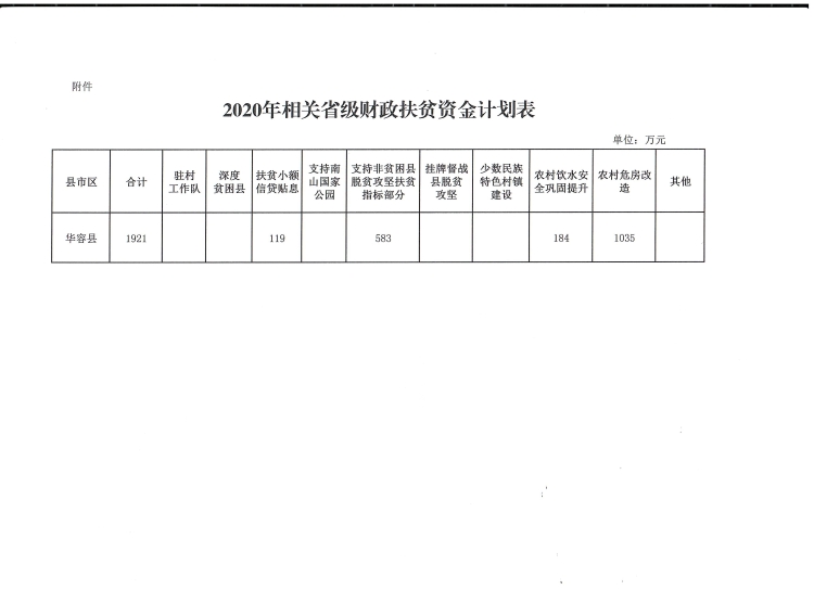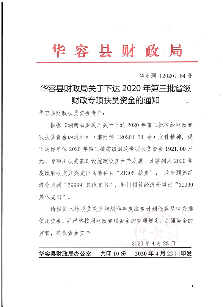 华财预[2020]64号[华容县财政局关于下达2020年第三批省级财政专项扶贫资金的通知]-1921万