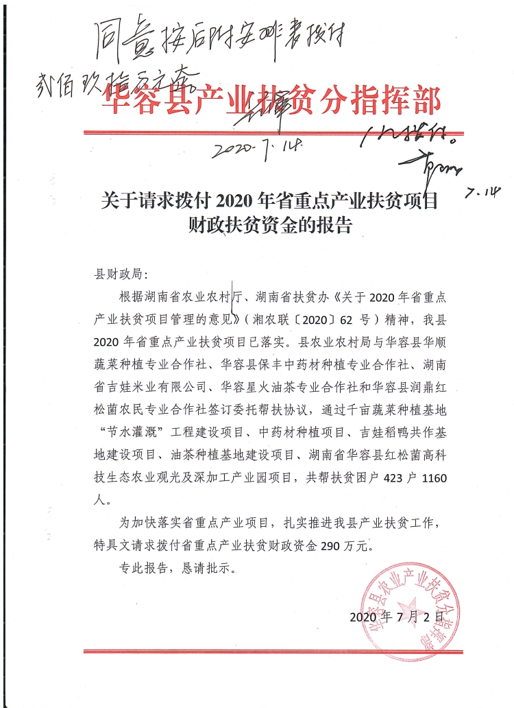 关于拨付2020年省重点产业扶贫项目财政扶贫资金的报告-290万