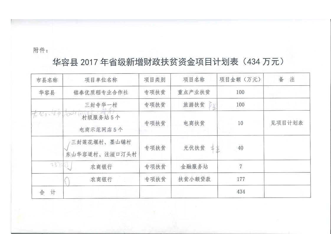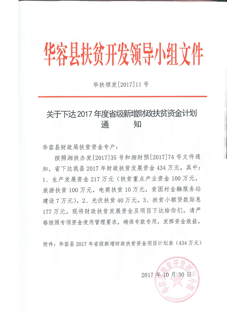 华扶领发(2017)11号-关于下达2017年度省级新增财政扶贫资金计划通知(434万)