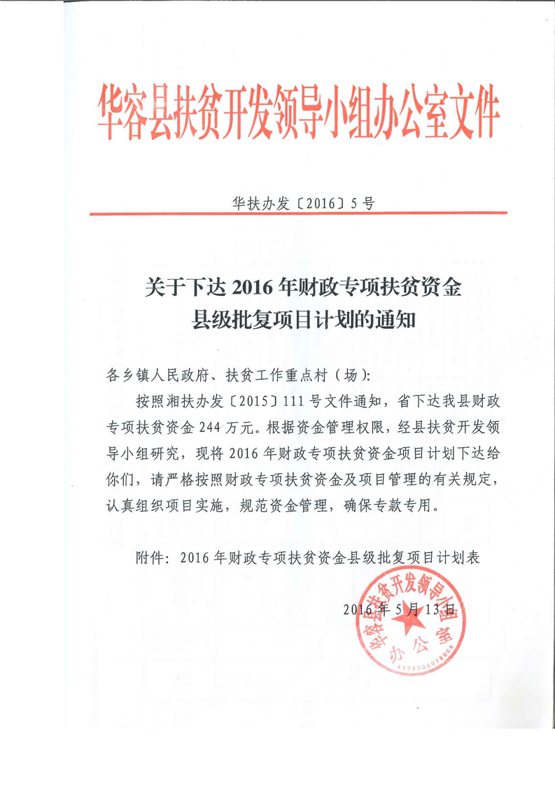 华扶办发(2016)5号-关于下达2016年财政专项资金县级批复项目计划的通知(244万)