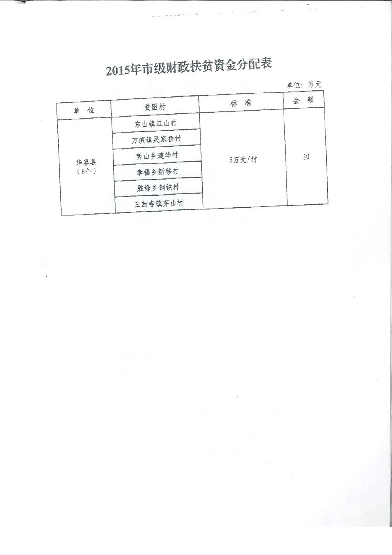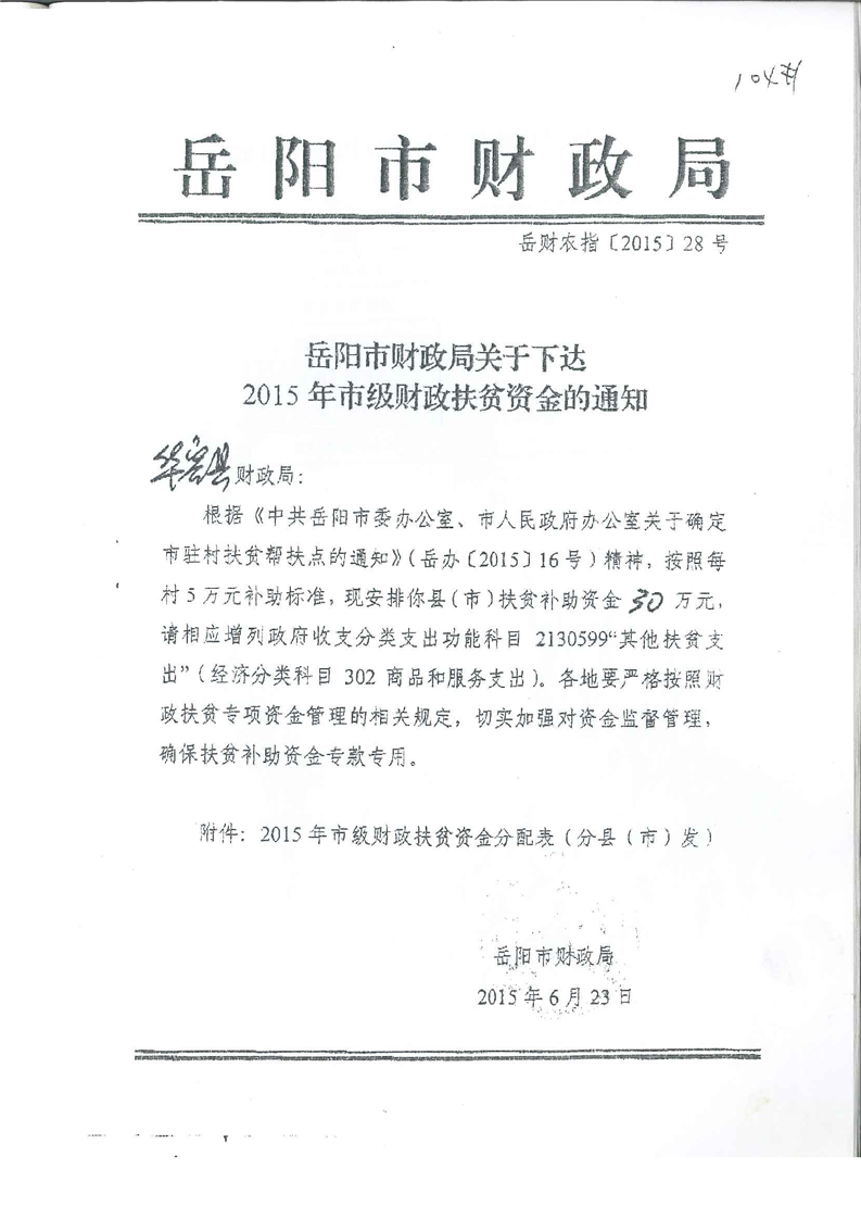 岳财农指(2015)28号-岳阳市财政局关于下达2015年市级财政扶贫资金的通知(30万元)