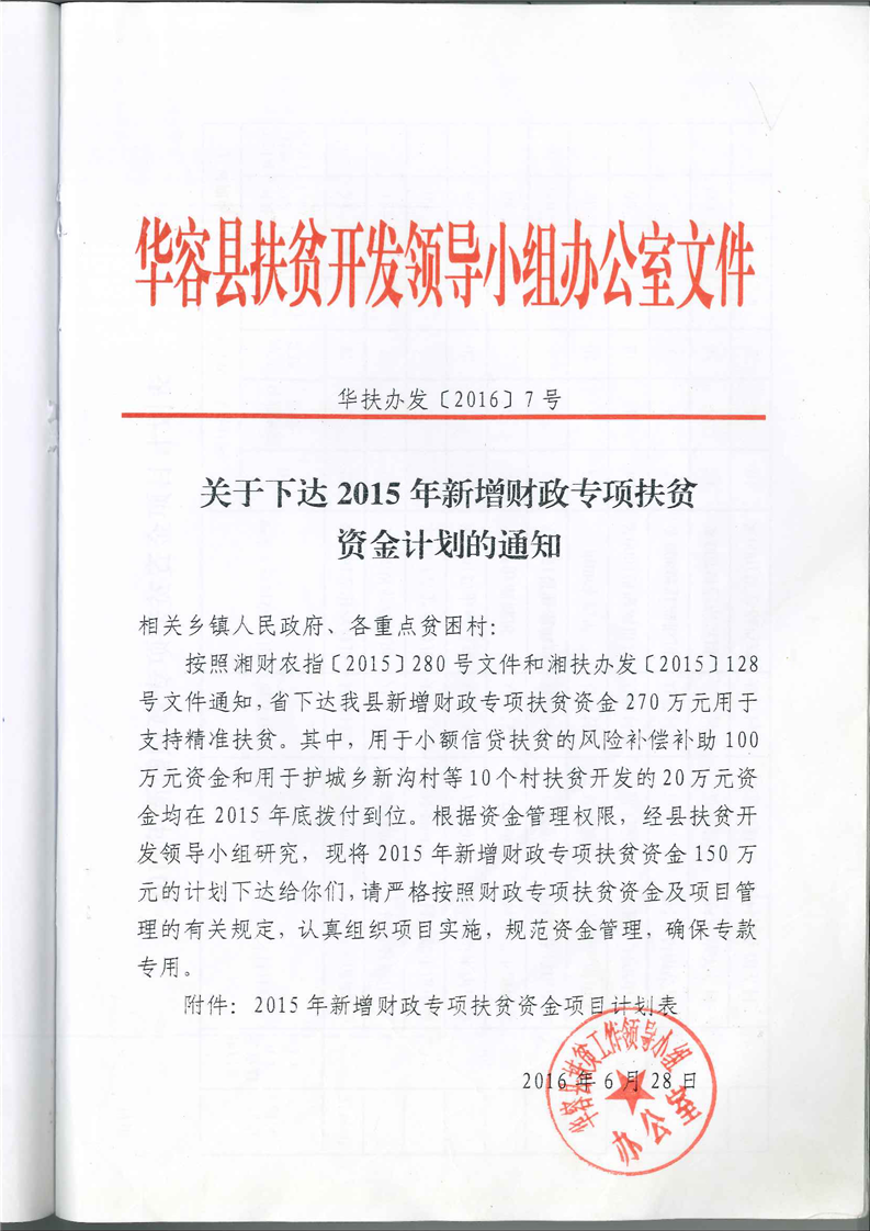 华扶办发(2016)7号-关于下达2015年新增财政专项扶贫资金计划的通知(270万元)