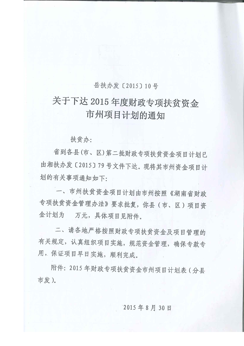 岳扶办发(2015)10号-关于下达2015年度财政专项扶贫资金市州项目计划的通知(30万元)