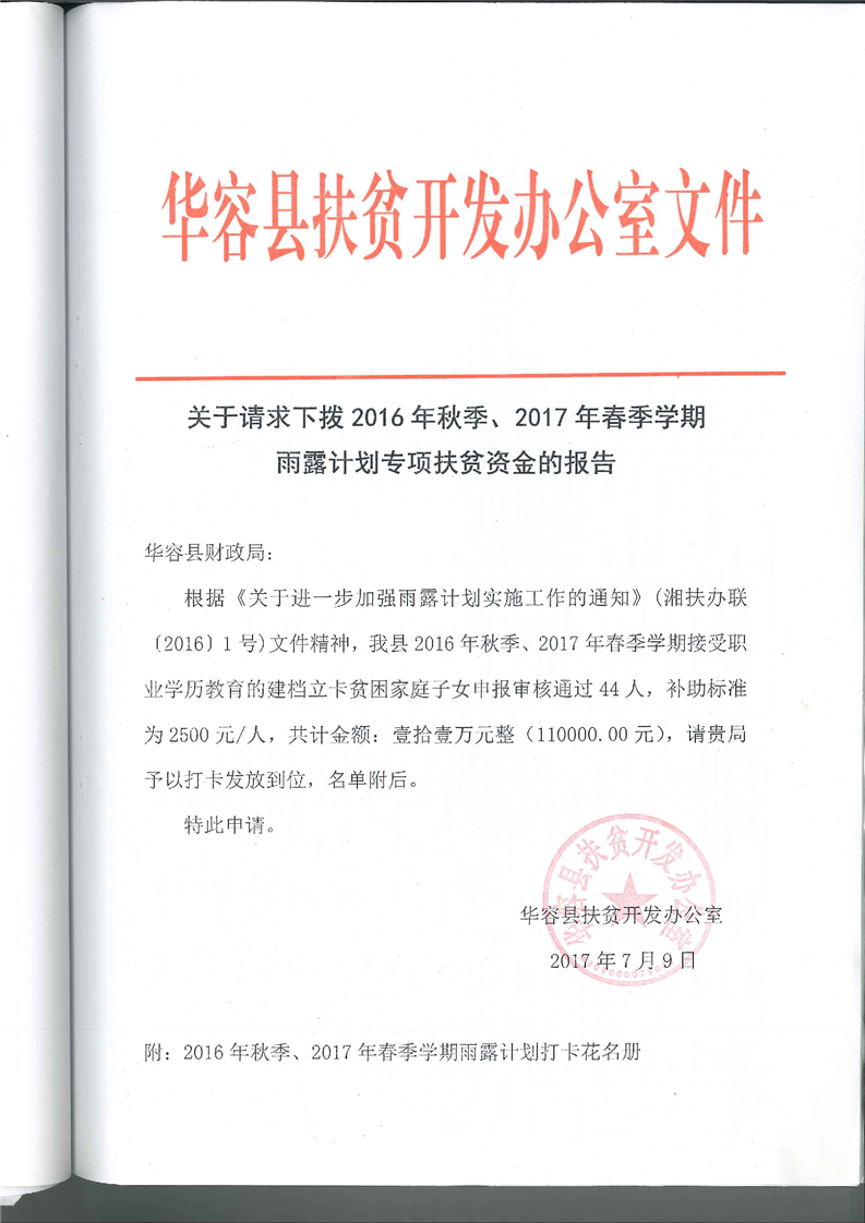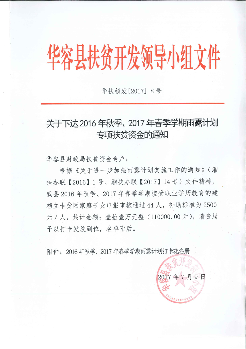 华扶领发(2017)8号-关于下达2016年秋季、2017年春季学期雨露计划专项扶贫资金的通知(11万元)