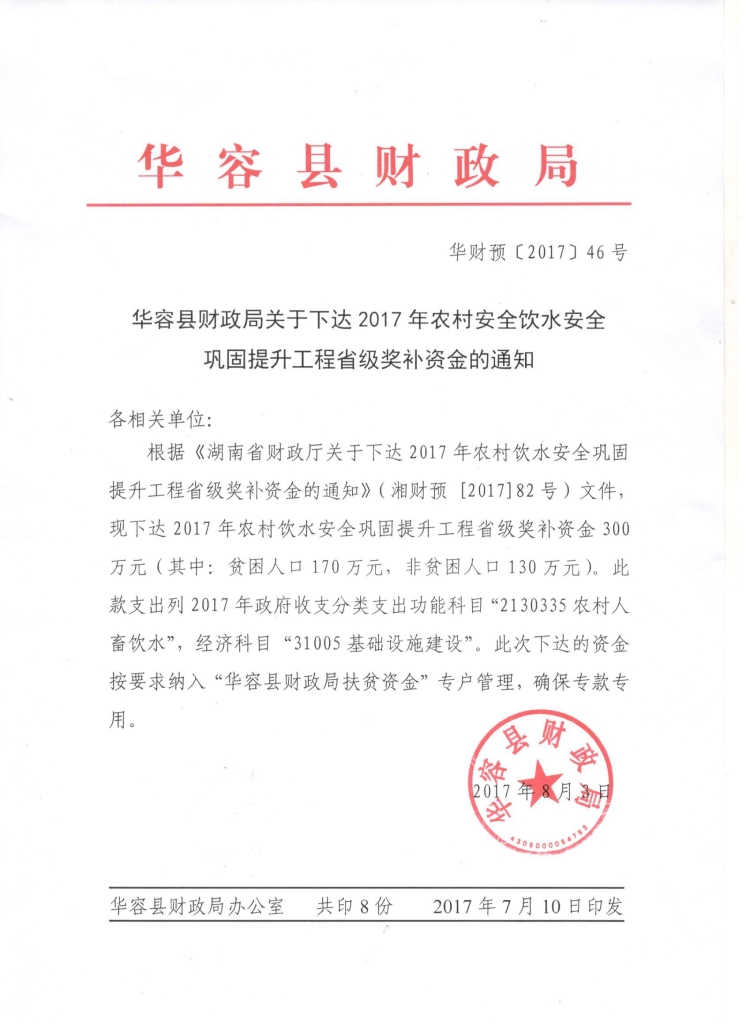 关于下达2017年农村安全饮水安全巩固提升工程升级奖补资金的通知-170万