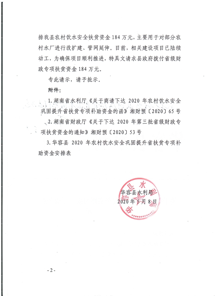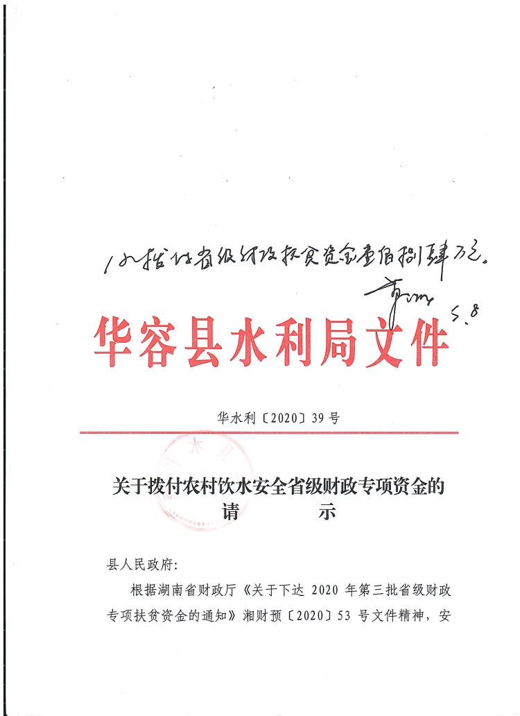 关于拨付农村饮水安全省级财政专项资金的请示-184万