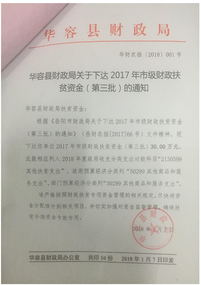 华财农指〔2018〕001号 关于下达2017年市级财政扶贫资金(第三批)的通知 30万